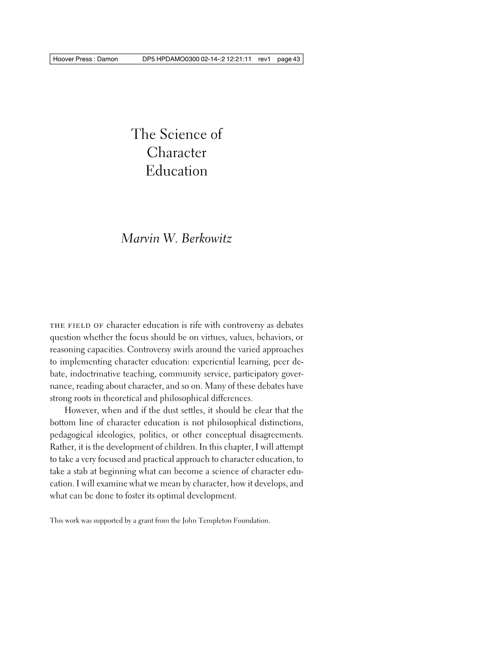 289 Chapter 7 Moral-Character Education Daniel Lapsley and David Yeager Moral-Character Education This chapter addresses one of the foundational issues that confront parents and educators: What is to be done about the moral character formation of children? Few would doubt that raising children of strong moral character is a highly desirable goal for socialization. Most parents would be disappointed if their children entered adulthood with only slight acquaintance with moral norms, dispositions, or emotions, or evinced these qualities only on occasion. But not only parents. The development of moral character is also a broadly shared goal that animates the work of socialization agents in every contextual setting that involves children, including schools and churches, youth organizations and other community institutions. Indeed, the concern over the proper induction of the younger generation by the older into the norms and canons of good conduct is probably a universal of the human experience. Yet the terms of reference for moral character education (MCE) is broadly contested whatever the basic agreement on the desirability of its goals (Goodman & Lesnick, 2001). Historically, the terms moral education and character education have pointed to different psychological traditions, ethical theories, curricular objectives and pedagogical preferences. Whether one is a moral educator or a character educator is thought to reveal something about one’s paradigmatic allegiances, about where one stands in terms of certain defining issues that sorts one into rival camps, with each camp having its own professional society (e.g., Association for Moral Education, the Character Education Partnership) and professional journal (e.g., Journal of Moral Education, Journal of Research in Character Education). -