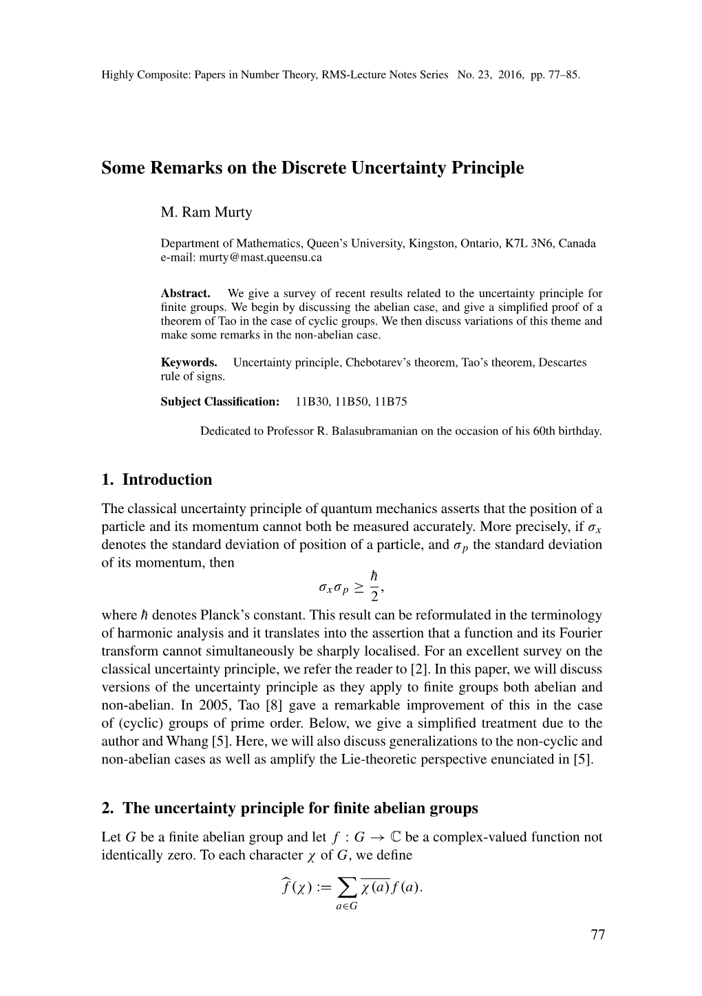ARITHMETIC EQUIVALENCE AND ISOSPECTRALITY ANDREW V.SUTHERLAND ABSTRACT. In these lecture notes we give an introduction to the theory of arithmetic equivalence, a notion originally introduced in a number theoretic setting to refer to number fields with the same zeta function. Gassmann established a direct relationship between arithmetic equivalence and a purely group theoretic notion of equivalence that has since been exploited in several other areas of mathematics, most notably in the spectral theory of Riemannian manifolds by Sunada. We will explicate these results and discuss some applications and generalizations. 1. AN INTRODUCTION TO ARITHMETIC EQUIVALENCE AND ISOSPECTRALITY Let K be a number field (a finite extension of Q), and let OK be its ring of integers (the integral closure of Z in K). The Dedekind zeta function of K is defined by the Dirichlet series X s Y s 1 ζK (s) := N(I)− = (1 N(p)− )− I OK p − ⊆ where the sum ranges over nonzero OK -ideals, the product ranges over nonzero prime ideals, and N(I) := [OK : I] is the absolute norm. For K = Q the Dedekind zeta function ζQ(s) is simply the : P s Riemann zeta function ζ(s) = n 1 n− . As with the Riemann zeta function, the Dirichlet series (and corresponding Euler product) defining≥ the Dedekind zeta function converges absolutely and uniformly to a nonzero holomorphic function on Re(s) > 1, and ζK (s) extends to a meromorphic function on C and satisfies a functional equation, as shown by Hecke [25]. The Dedekind zeta function encodes many features of the number field K: it has a simple pole at s = 1 whose residue is intimately related to several invariants of K, including its class number, and as with the Riemann zeta function, the zeros of ζK (s) are intimately related to the distribution of prime ideals in OK . -