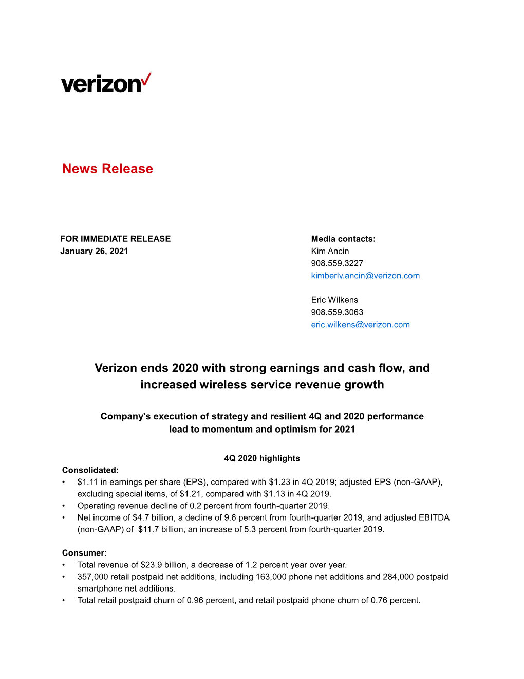 Minnesota State University Moorhead RED: a Repository of Digital Collections Dissertations, Theses, and Projects Graduate Studies Fall 12-20-2018 Verizon Wireless Communications: A Financial Analysis MacKenzie Barry [email protected] Follow this and additional works at: https://red.mnstate.edu/thesis Recommended Citation Barry, MacKenzie, "Verizon Wireless Communications: A Financial Analysis" (2018). Dissertations, Theses, and Projects. 147. https://red.mnstate.edu/thesis/147 This Project (696 or 796 registration) is brought to you for free and open access by the Graduate Studies at RED: a Repository of Digital Collections. It has been accepted for inclusion in Dissertations, Theses, and Projects by an authorized administrator of RED: a Repository of Digital Collections. For more information, please contact [email protected]. Verizon Wireless Communications: A Financial Analysis A Project Presented to the Graduate Faculty of Minnesota State University Moorhead By MacKenzie Frances Barry In Partial Fulfillment of the Requirements for the Degree of Master of Science in Accounting and Finance December 2018 Moorhead, Minnesota EXECUTIVE SUMMARY Verizon Communications, Inc. (VZ) operates the largest wireless and second largest wireline telecom networks in the United States. These two segments focus on providing communication, information, and entertainment to consumers, businesses, and government agencies. Verizon is based out of New York, New York and was incorporated in 2000. In recent news, the company has added 603,000 postpaid wireless customers, which was well above the consensus estimate of 438,000 subscriber additions. The solid customer additions were partially due to a significant year-over-year drop in churn (percentage of consumers leaving Verizon). Verizon also announced that Marni Walden, executive vice president and president of global media, left the company in February 2018. -