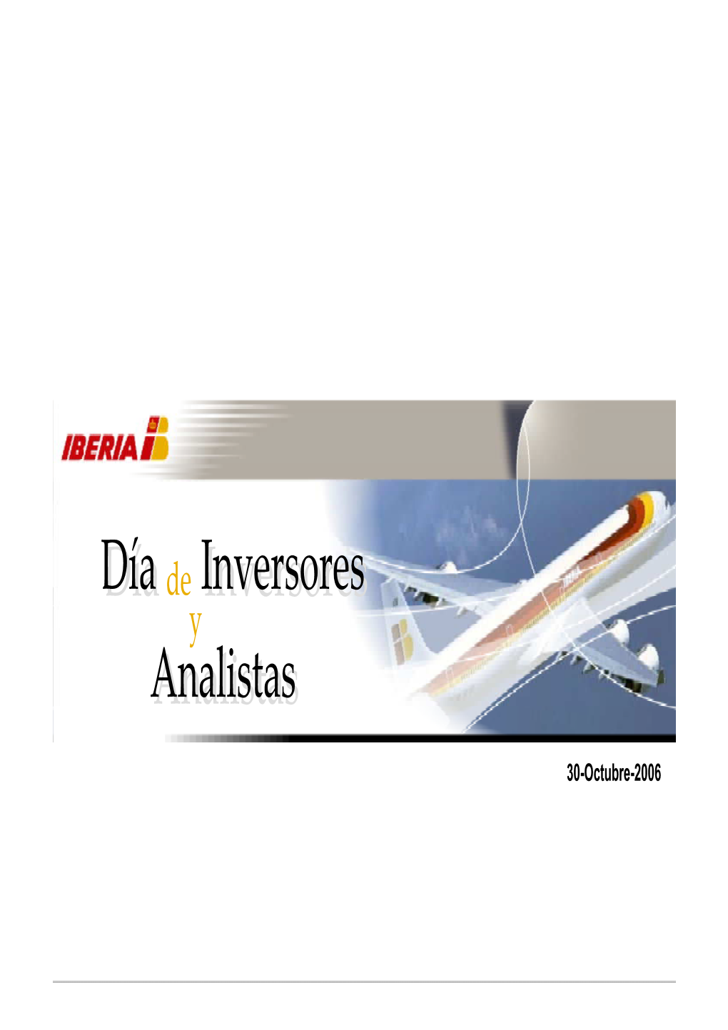 AnalystAnalyst and InvestorInvestor DayDay 30th-October-2006 Index Year 2006: Nine Months Results § Mr. Fernando Conte García (Chairman & CEO) Director Plan 2006-08: Evolution and Progress § Mr. Manuel López Colmenarejo (Commercial Director) § Mr. Enrique Dupuy de Lôme (CFO & Head of Corporate Strategy) Maintenance Business § Mr. Manuel López Aguilar (Maintenance Director) Summary & Outlook § Mr. Fernando Conte García (Chairman & CEO) Disclaimer The information contained in this document has been provided by Iberia. No representation or warranty, expressed or implied, is made by Iberia as to the accuracy or completeness of any such information, and nothing contained in this document is, or shall be relied upon as, a promise or representation by Iberia. In particular, this analysts' presentation contains statements that constitute forward-looking statements and information relating to the activities of Iberia that are based on the beliefs of Iberia's management as well as assumptions based on information available to Iberia. Such statements reflect the current view of Iberia or its management with respect to future events. They are not guarantees of future performance and are subject to certain risks, uncertainties and assumptions. Many factors could cause the actual results, performance or achievements of Iberia to be materially different from any future results, performance or achievements of Iberia that may be expressed or implied by such forward-looking statements. Analysts are cautioned not to place undue reliance on those forward-looking statements, which speak only as of the date of this presentation. Iberia does not intend, and does not assume any obligation, to update forward-looking statements set out in this document.