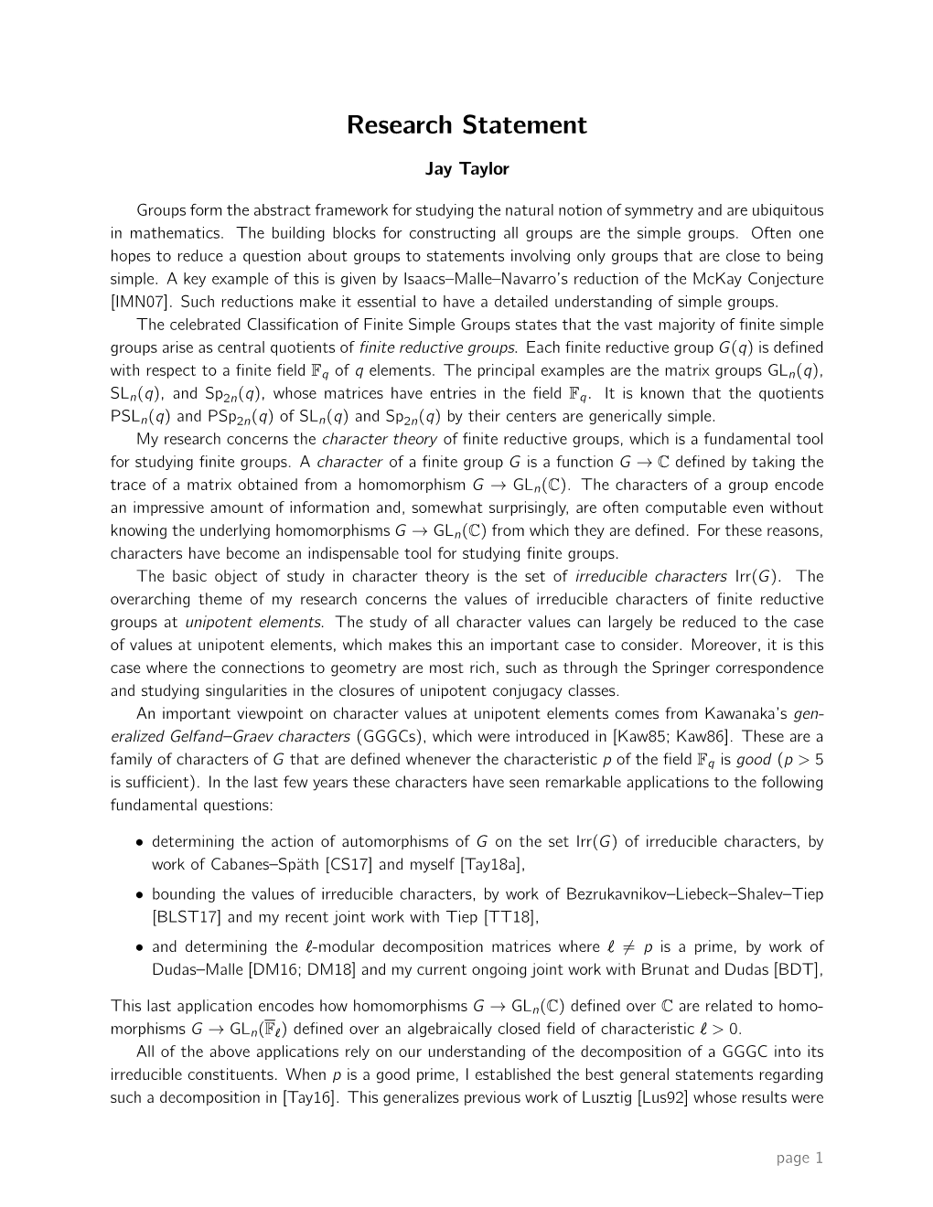 Research Statement Anders O.F. Hendrickson December 6, 2010 1 Supercharacter Theories 1.1 Background Since the time of Burnside and Frobenius, one of the most important ways to study finite groups has been via their representations. The representation theory of finite groups over C and over fields of positive characteristic, especially the work of Brauer, played a large role in the classification of finite simple groups, and today it has strong connections with the study of Lie algebras, algebraic topology, homotopy theory, and group actions on finite complexes. Let G be a finite group; then a complex representation of G is a homomorphism from G into a group of complex matrices. It turns out that almost everything to be gained from the representation theory of G over C is captured by the traces of these homomorphisms, which are called the characters of G. Sums of characters are again characters, but those characters that are not sums we call irreducible. The set Irr(G) of irreducible characters in fact is finite and forms an orthonormal basis for the space of class functions of G. Since characters are constant on conjugacy classes, the character theory of G is completely described by its character table, a square matrix whose rows are labeled by Irr(G) and columns by the conjugacy classes. Although it captures a great deal of information about the group, unfortunately to compute the character table explicitly is quite difficult in many cases. It would be very desirable to find a simpler object, easier to compute than the character table, which nevertheless captures much of the same information. -