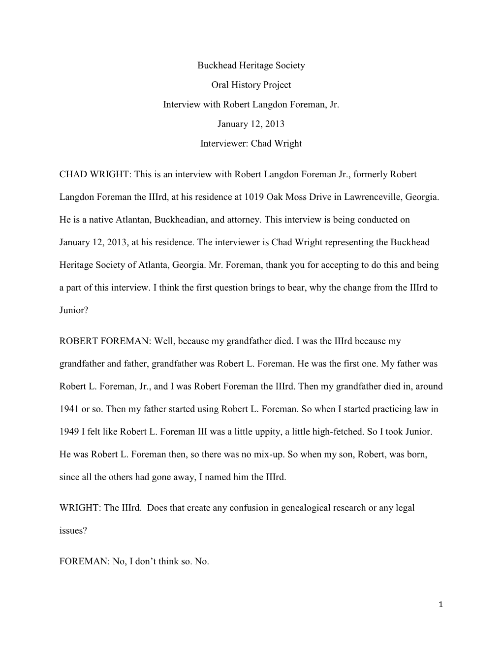 Buckhead Heritage Oral History Project, Robert Foreman.Pdf