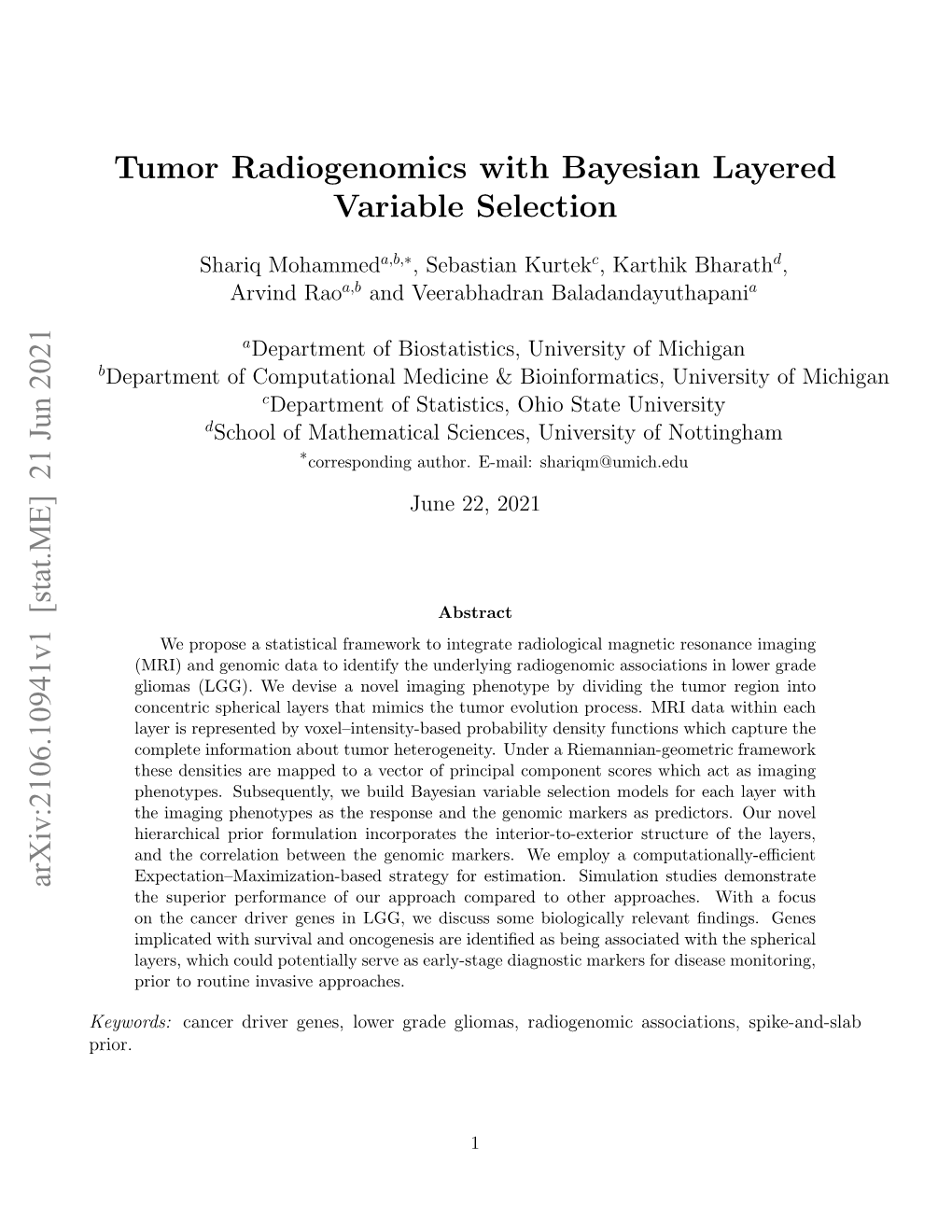 Tumor Radiogenomics with Bayesian Layered Variable Selection Arxiv:2106.10941V1 [Stat.ME] 21 Jun 2021