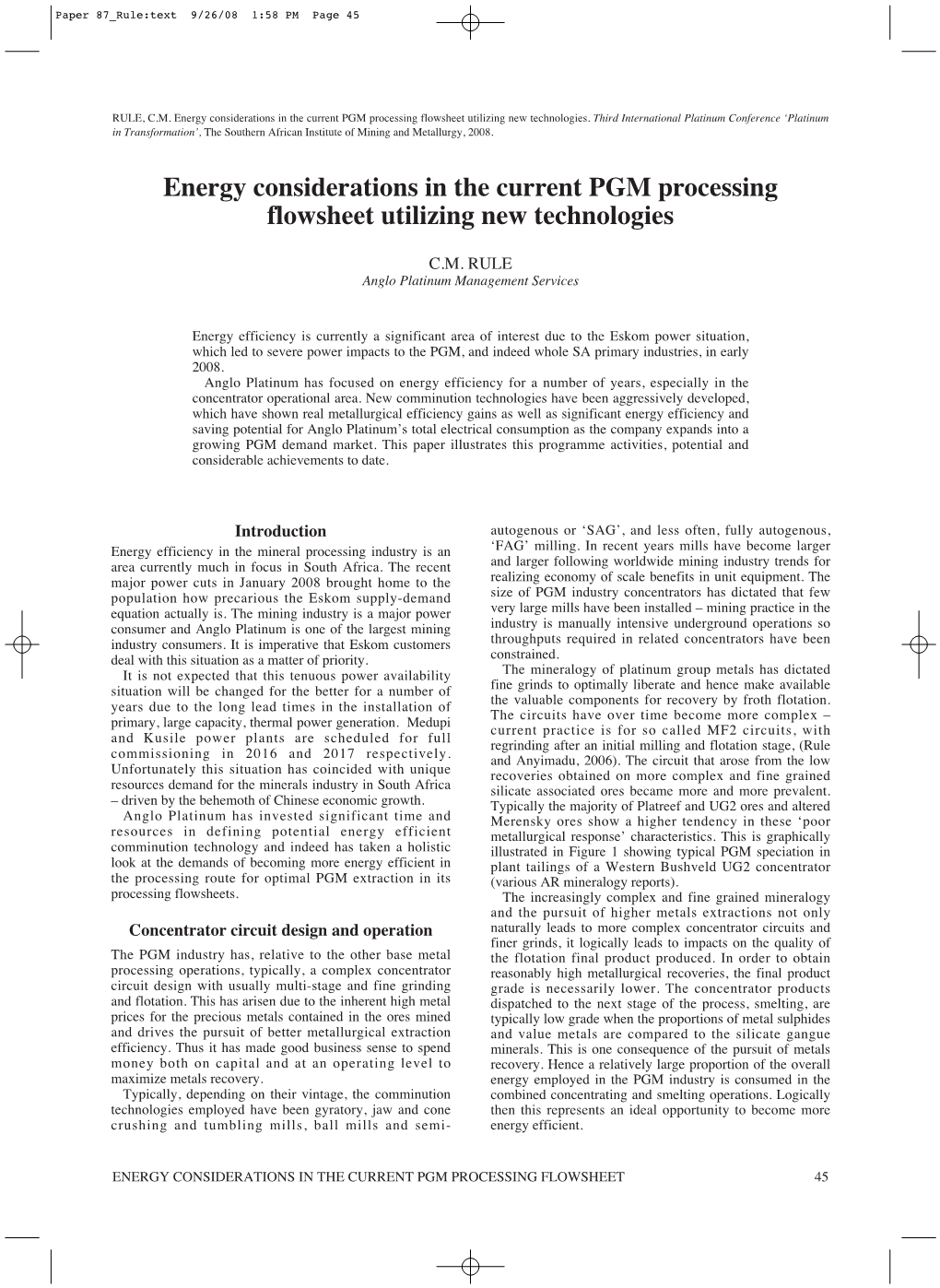 Energy Considerations in the Current PGM Processing Flowsheet Utilizing New Technologies