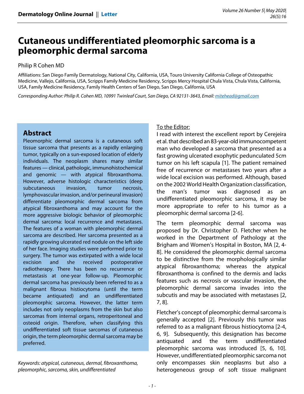 Cutaneous Undifferentiated Pleomorphic Sarcoma Is a Pleomorphic Dermal Sarcoma