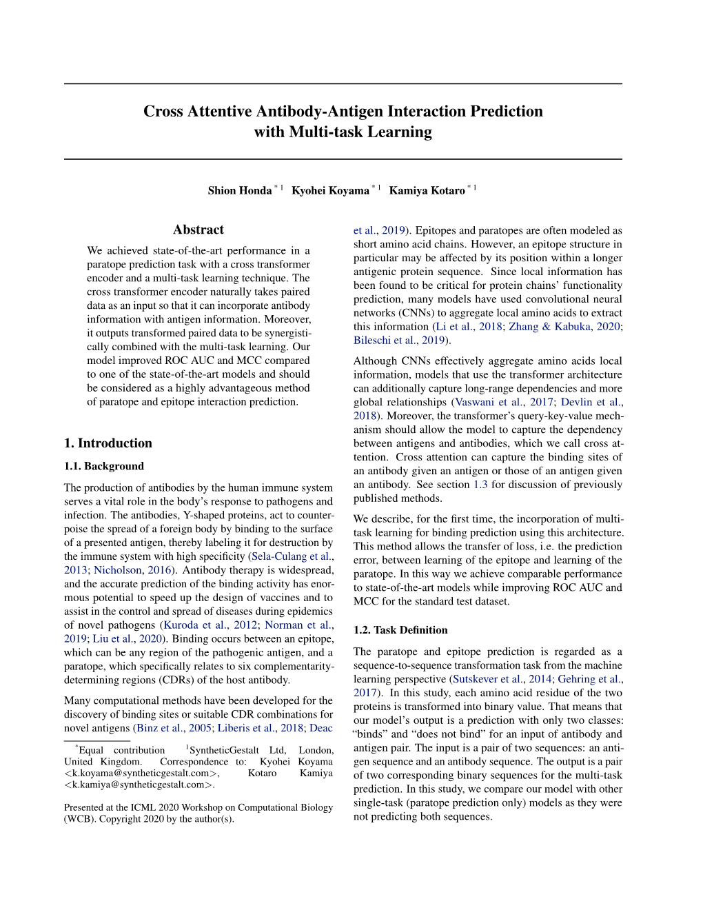 Neural message passing for joint paratope-epitope prediction Alice Del Vecchio 1 Andreea Deac 2 3 4 Pietro Lio` 1 Petar Velickoviˇ c´ 4 Abstract Hence, both the antibody and the antigen may be viewed as sequences of amino acid residues. Their binding site Antibodies are proteins in the immune system consists of two regions: the paratope on the antibody, and which bind to antigens to detect and neutralise the epitope on its corresponding antigen. Predicting them them. The binding sites in an antibody-antigen can therefore be posed as a binary classification problem: interaction are known as the paratope and epitope, for each amino acid residue in the antibody and antigen, respectively, and the prediction of these regions respectively, do they participate in the binding? is key to vaccine and synthetic antibody develop- ment. Contrary to prior art, we argue that paratope However, proteins can also be considered as graphs with its and epitope predictors require asymmetric treat- residues as nodes, with two nodes sharing an edge if their ment, and propose distinct neural message passing residues are spatially close. Recently, such contact graphs architectures that are geared towards the specific have been directly leveraged for protein function prediction aspects of paratope and epitope prediction, re- by Gligorijevic et al.(2020). spectively. We obtain significant improvements The advantage of considering a sequence based approach on both tasks, setting the new state-of-the-art and over a graph-based approach is that structural information recovering favourable qualitative predictions on is much harder to obtain. However, recent advancements antigens of relevance to COVID-19. -