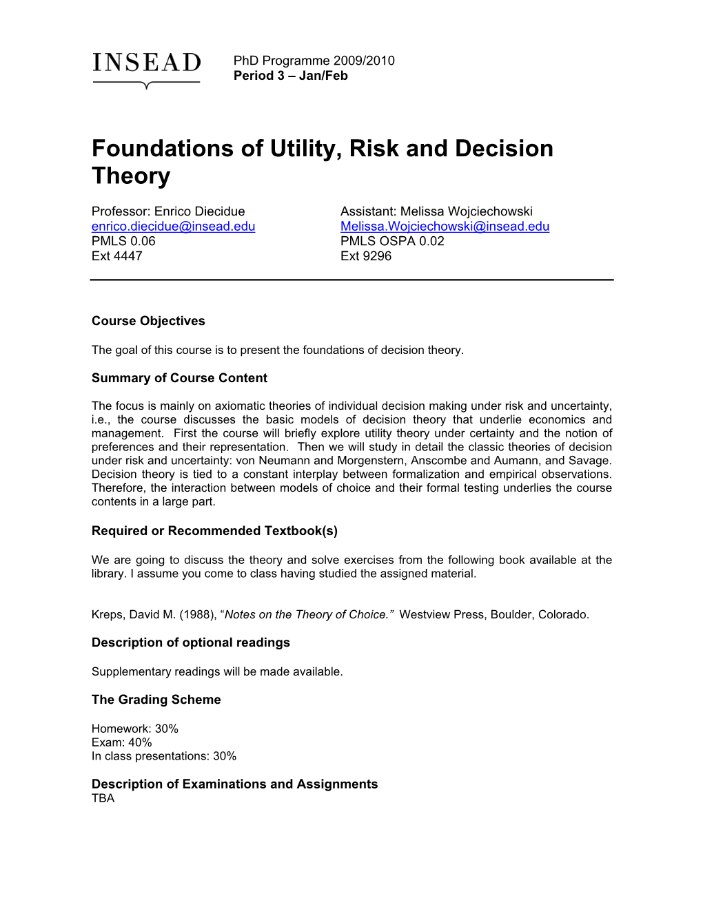 Economics 206, Decisions Winter 2007 Vincent Crawford Economics 319, 534-3452, [email protected] Organization: Economics 206 meets from 11:00-12:20 on Mondays and Wednesdays, January 8 through March 14 (university holidays January 15 and February 19 excepted), in Economics 210. My office hours throughout the quarter will be Wednesdays from 2:00-3:00 or by appointment. The course website is http://weber.ucsd.edu/~vcrawfor/econ206.html. The first half (approximately) will cover standard topics in the traditional theory of decisions. The second half will cover topics in behavioral decision theory. Instead of a final exam there will be two take-home mini-exams, one for each half. You must work on these individually, without consulting anyone but me. The first mini-exam will be posted on the website by 4 p.m. Wednesday, February 7, and due by email or in the course mailbox in Economics Student Services by 4 p.m. Friday, February 9. The second mini- exam will be posted by 4 p.m. Wednesday, March 14, and due by email or in the course mailbox by 4 p.m. Friday, March 16 (the last day of classes). The 48-hour time limits are a humanitarian gesture, and should not be binding. The dates are firm except for extreme unforeseeable events, in which case exceptions must be requested as soon as possible. I will also post optional problem sets, which should be good practice for the exams, before each segment. The second exam will include a flexible essay question on behavioral decision theory, which will be posted by the second half. -