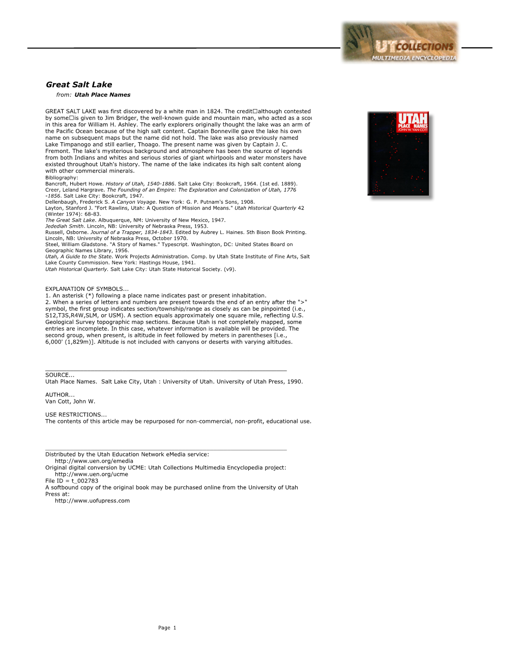 Great Salt Lake From: Utah Place Names