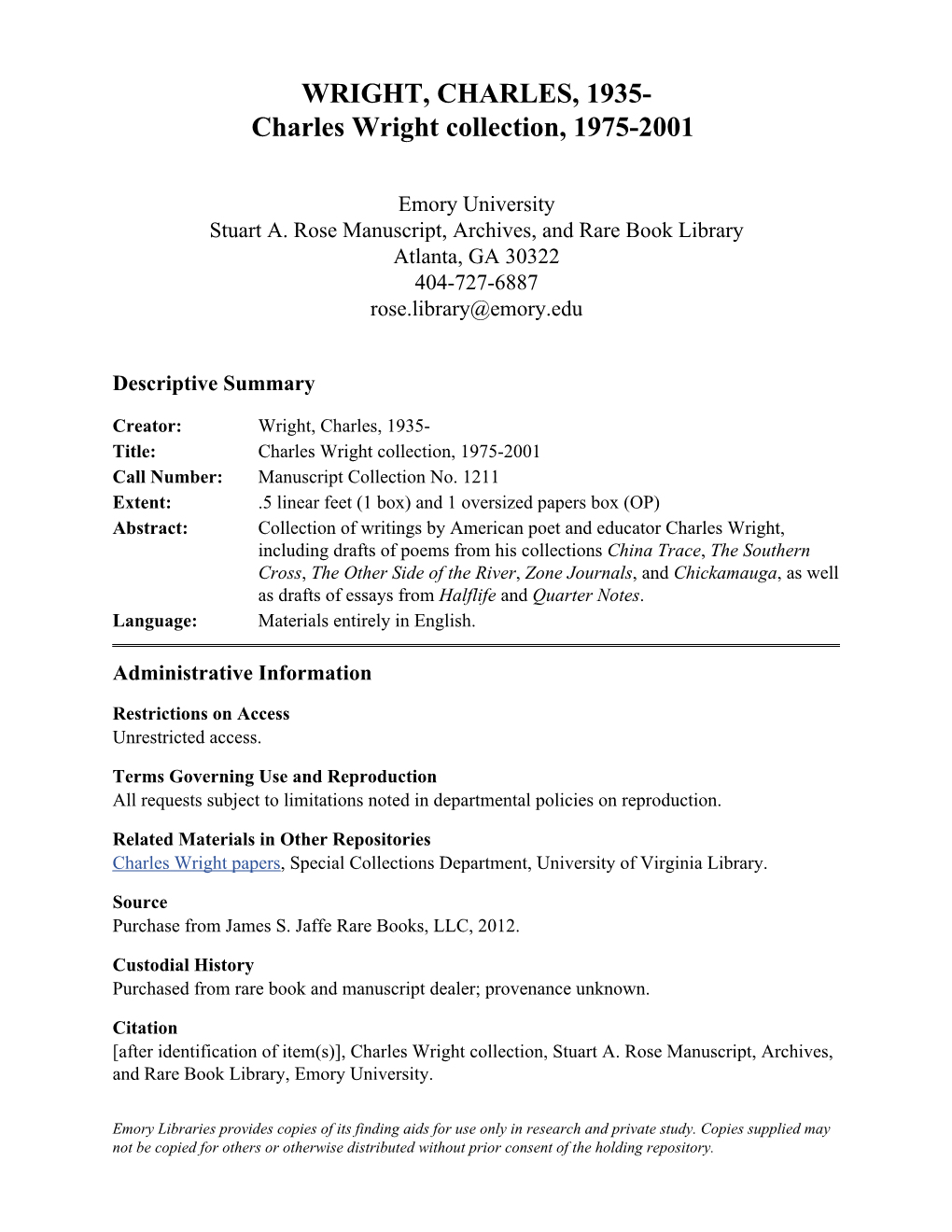 WRIGHT, CHARLES, 1935- Charles Wright Collection, 1975-2001