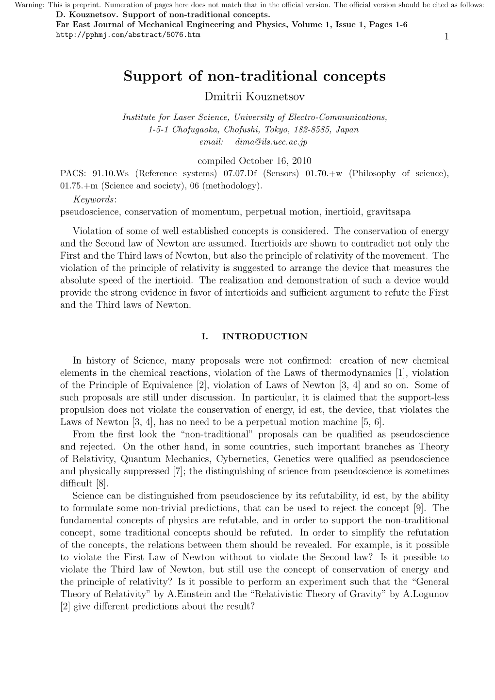 Zero-point fluctuations in rotation: Perpetuum mobile of the fourth kind without energy transfer M. N. Chernodub To cite this version: M. N. Chernodub. Zero-point fluctuations in rotation: Perpetuum mobile of the fourth kind without energy transfer. Mathematical Structures in Quantum Systems and pplications, Jun 2012, Benasque, Spain. 10.1393/ncc/i2013-11523-5. hal-01100378 HAL Id: hal-01100378 https://hal.archives-ouvertes.fr/hal-01100378 Submitted on 9 Jan 2015 HAL is a multi-disciplinary open access L’archive ouverte pluridisciplinaire HAL, est archive for the deposit and dissemination of sci- destinée au dépôt et à la diffusion de documents entific research documents, whether they are pub- scientifiques de niveau recherche, publiés ou non, lished or not. The documents may come from émanant des établissements d’enseignement et de teaching and research institutions in France or recherche français ou étrangers, des laboratoires abroad, or from public or private research centers. publics ou privés. Zero-point fluctuations in rotation: Perpetuum mobile of the fourth kind without energy transfer∗ M. N. Chernoduby CNRS, Laboratoire de Math´ematiqueset Physique Th´eorique,Universit´eFran¸cois-Rabelais Tours, F´ed´eration Denis Poisson, Parc de Grandmont, 37200 Tours, France Department of Physics and Astronomy, University of Gent, Krijgslaan 281, S9, B-9000 Gent, Belgium In this talk we discuss a simple Casimir-type device for which the rotational energy reaches its global minimum when the device rotates about a certain axis rather than remains static. This unusual property is a direct consequence of the fact that the moment of inertia of zero-point vacuum fluctuations is a negative quantity (the rotational vacuum effect). -