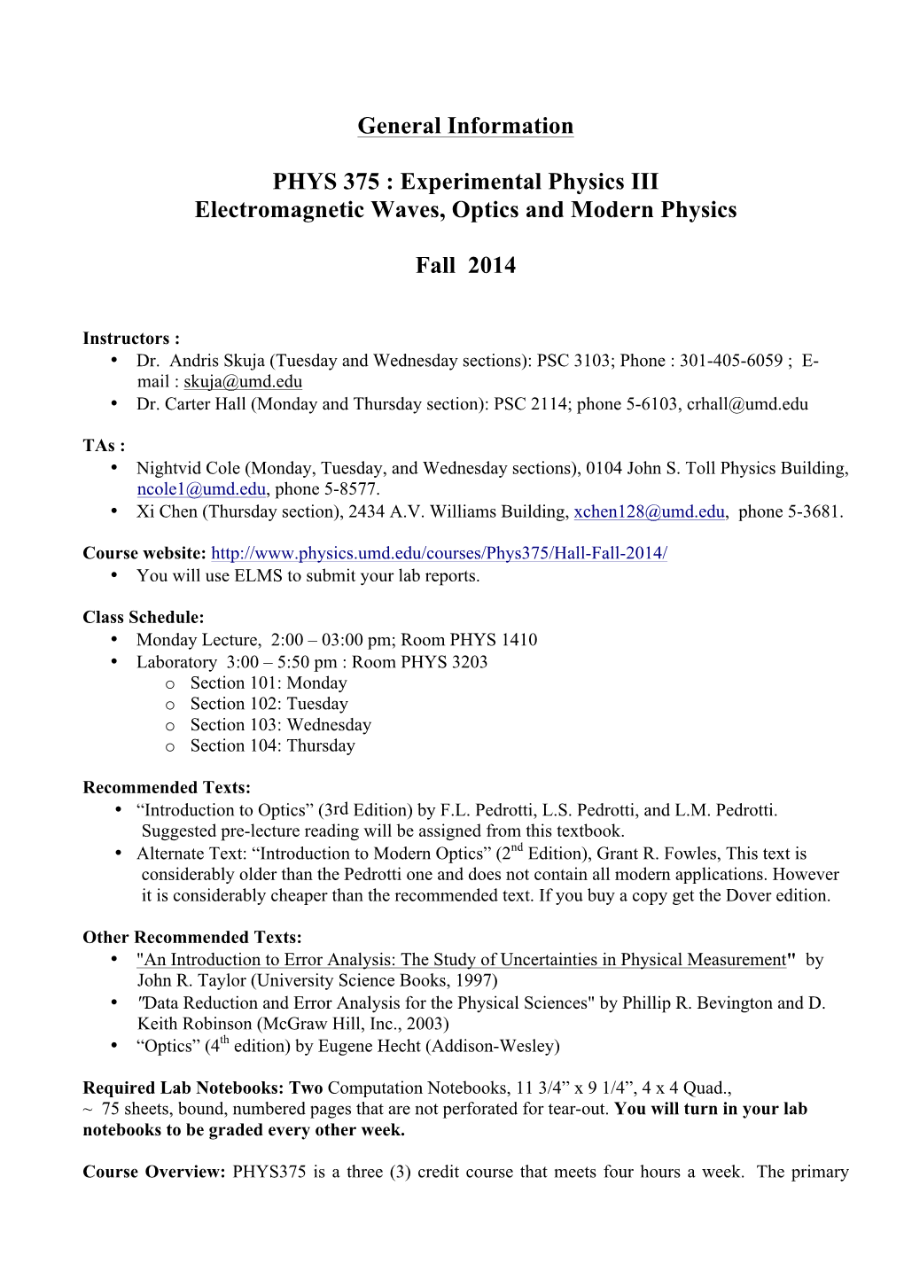 Experimental Physics Seminar PHYS 210, Spring 2006 Department of Physics Princeton University Prof. Michael Romalis, Office: Jadwin 230, Phone 8-5586, e-mail: [email protected] TA: Georgios Vasilakis Office: Jadwin B21, Phone 8-0702, e-mail: [email protected] Technical: Dan Hoffman Office: Jadwin B19, Phone 8-5441, e-mail: [email protected] Web page: www.princeton.edu/~romalis/PHYS210 Class: Wednesday, 7:30 –10:20, Jadwin 475 and 469 Class structure In the first half of the semester we will go over modern experimental physics techniques in major areas of physics: high energy and nuclear physics, condensed matter physics, atomic physics, astrophysics, and biophysics. The emphasis will be on actual hands-on experimental aspects. The underlying physics, some of which may be new to you, will be covered in a “hand-waving” fashion to give you a taste of things discussed in more advanced physics classes. You will be expected to read lecture notes available on the web before the class. We will typically have a 30-min lecture followed by “show-and-tell” of the experimental apparatus. The first three labs will be particularly hands-on and will focus on LabView, a program commonly used for computer control of experiments, and simple electronic circuits. In the second half of the semester you will work on independent projects in groups of 2-4 people. A list of possible projects is given below. You are also welcome to propose your own project ideas. If you ever wanted to build a crazy contraption or demonstrate a counter-intuitive physical effect, now is your chance to do it with full support of Princeton Physics department! We are also looking for new ideas for Freshman lab experiments. -