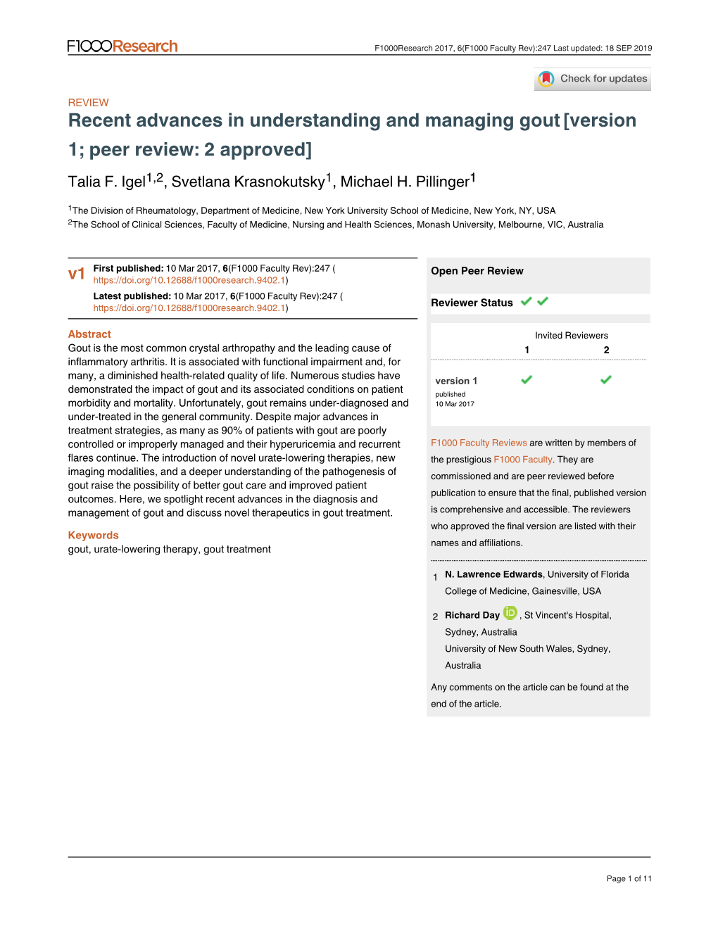Recent Advances in Understanding and Managing Gout[Version 1; Peer