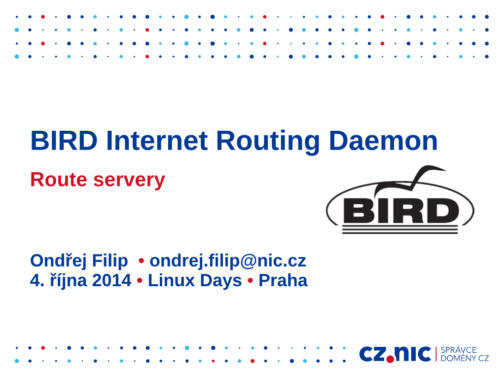 Směrovací démon BIRD CZ.NIC z. s. p. o. Ondřej Filip / [email protected] 8. 6. 2010 – IT10 1 Směrování a forwarding ● Router - zařízení připojené k více sítím ● Umí přeposlat „cizí“ zprávu - forwarding ● Cestu pozná podle směrovací (routovací) tabulky ● Sestavování routovací tabulky – routing – Statické – Dynamické ● Interní - uvnitř AS rychlé, důvěřivé, přesné – RIP, OSPF ● Externí (mezi AS, pomalé, filtering, přibližné – pouze BGP 2 Rozdělení směrovacích protokolů AS 2 RIP BGP AS 1 OSPF BGP BGP AS 3 3 static Směrovací démon ● Na Linuxu (a ostatních UNIXech) – uživatelská aplikace mimo jádro, forwarding v jádře ● Obvykle implementuje více směrovacích protokolů ● Směrovací politika - filtrování ● Quagga (Zebra) – Cisco syntax http://www.quagga.net ● OpenBGPd - http://www.openbgpd.org ● GateD – zastaralý, ne volná licence ● BIRD 4 Historie projektu ● Start projektu v roce 1999 ● Seminární projekt – MFF UK Praha ● Projekt uspán ● Drobné probuzeni v letech 2003 a 2006 (CESNET) ● Plně obnoveno na přelomu 2008/2009 v rámci Laboratoří CZ.NIC - http://labs.nic.cz 5 Cíle projektu ● Opensource směrovací démon – alternativa k tehdejšímu démonu Quagga/Zebra (GateD) ● Rychlý a efektivní ● Portabilní, modulární ● Podpora současných směrovacích protokolů ● IPv6 a IPv4 v jednom zdrojovém kódu (dvojí překlad) ● Snadná konfigurace a rekonfigurace (!) ● Silný filtrovací jazyk 6 Vlastnosti ● Portabilní – Linux, FreeBSD, NetBSD, OpenBSD ● Podpora IPv4 i IPv6 ● Static, RIP, OSPF, BGP - Route reflektor, Směrovací server (Route server) ASN32 (ASPLAIN), MD5 -