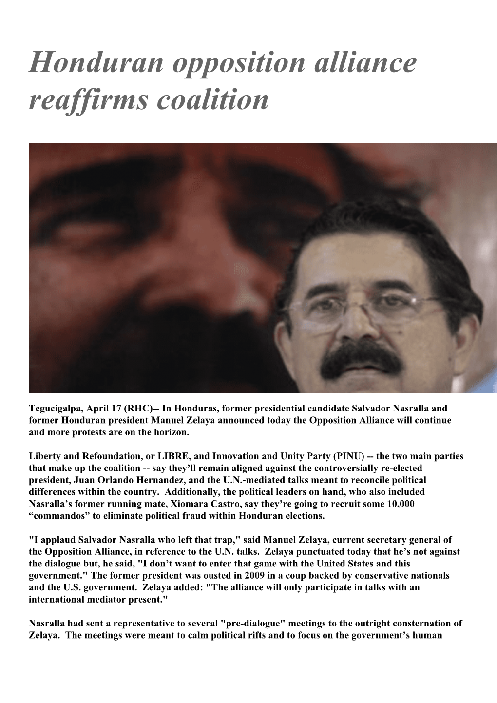 Honduran Opposition Alliance Reaffirms Coalition