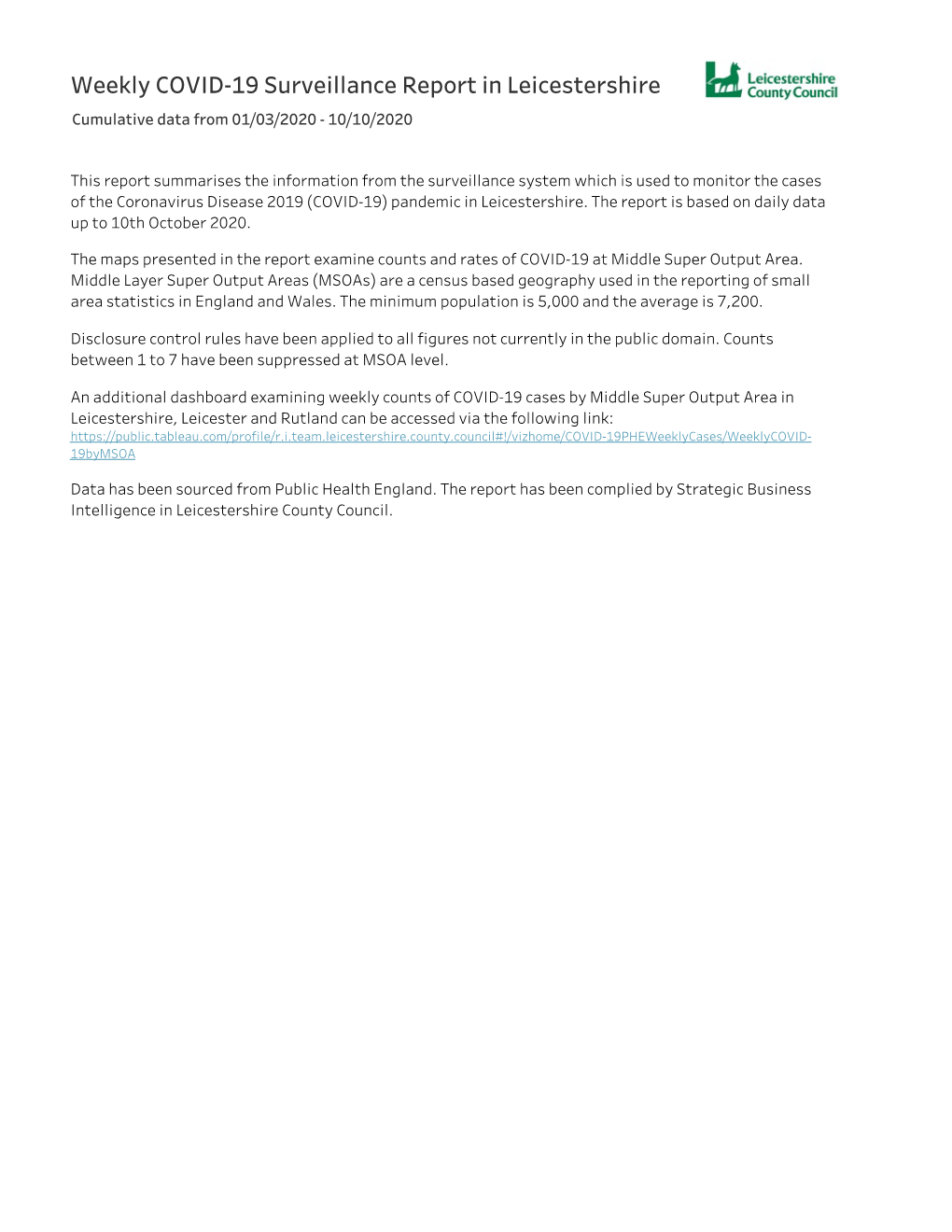 Weekly COVID-19 Surveillance Report in Leicestershire Cumulative data from 01/03/2020 - 29/09/2021 This report summarises the information from the surveillance system which is used to monitor the cases of the Coronavirus Disease 2019 (COVID-19) pandemic in Leicestershire. The report is based on daily data up to 29th September 2021. The maps presented in the report examine counts and rates of COVID-19 at Middle Super Output Area. Middle Layer Super Output Areas (MSOAs) are a census based geography used in the reporting of small area statistics in England and Wales. The minimum population is 5,000 and the average is 7,200. Disclosure control rules have been applied to all figures not currently in the public domain. Counts between 1 to 5 have been suppressed at MSOA level. An additional dashboard examining weekly counts of COVID-19 cases by Middle Super Output Area in Leicestershire, Leicester and Rutland can be accessed via the following link: https://public.tableau.com/profile/r.i.team.leicestershire.county.council#!/vizhome/COVID-19PHEWeeklyCases/WeeklyCOVID- 19byMSOA Data has been sourced from Public Health England. The report has been complied by Business Intelligence Service in Leicestershire County Council. Weekly COVID-19 Surveillance Report in Leicestershire Cumulative data from 01/03/2020 - 29/09/2021 Breakdown of testing by Pillars of the UK Government’s COVID-19 testing programme: Pillar 1 + 2 Pillar 1 Pillar 2 combined data from both Pillar 1 and Pillar 2 data from swab testing in PHE labs and NHS data from swab testing for the -