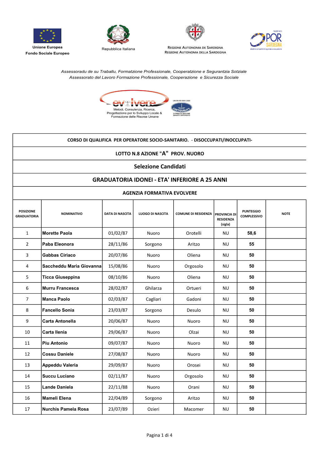 Unione Europea Repubblica Italiana REGIONE AUTONOMA DE SARDIGNA Fondo Sociale Europeo REGIONE AUTONOMA DELLA SARDEGNA Assessoradu de su Traballu, Formatzione Professionale, Cooperatzione e Segurantzia Sotziale Assessorato del Lavoro Formazione Professionale, Cooperazione e Sicurezza Sociale CORSO DI QUALIFICA PER OPERATORE SOCIO-SANITARIO. - DISOCCUPATI/INOCCUPATI- LOTTO N.8 AZIONE "A" PROV. NUORO Selezione Candidati GRADUATORIA IDONEI - ETA' SUPERIORE A 25 ANNI AGENZIA FORMATIVA EVOLVERE POSIZIONE PUNTEGGIO NOMINATIVO DATA DI NASCITA LUOGO DI NASCITA COMUNE DI RESIDENZA NOTE GRADUATORIA PROVINCIA DI COMPLESSIVO RESIDENZA (sigla) 1 Sale Loretina 10/10/56 Mamoiada Mamoiada NU 75 2 Ganga Graziano 18/12/57 Nuoro Nuoro NU 70 3 Fele Giovanna Maria 07/09/60 Oliena Oliena NU 70 4 Gioi Anna 27/02/64 Desulo Desulo NU 70 5 Sanna Adriana 23/10/68 Solarussa Ovodda NU 70 6 Sotgiu Antonella 31/05/70 Sorgono Belvì NU 70 7 Zedda Graziella 21/08/71 Tiana Tiana NU 70 8 Picca Enrica 30/09/75 Nuoro Oliena NU 70 9 Moi Milvia 10/01/68 Urzulei Nuoro NU 65 10 Mureddu Tiziana 16/07/74 Austis Austis NU 65 11 Nuvoli Elisa 10/04/76 Nuoro Ollollai NU 65 12 Zoroddu Tonina 24/07/84 Nuoro Ottana NU 65 13 Mura Valentina 11/08/84 Nuoro Silanus NU 65 14 Morittu Giovanna 30/12/84 Nuoro Orotelli NU 65 15 Nieddu Caterina 21/08/72 Dorgali Dorgali NU 61,35 16 Sale Maria Grazia 12/02/81 Nuoro Fonni NU 60,6 17 Manca Grazia 23/05/60 Nuoro Nuoro NU 60 18 Curreli Rosalba 01/03/63 Ovodda Ovodda NU 60 La Croce Battistina 19 16/07/64 Tonara Tonara NU 60 Carmen 20 Carta Anna Rita 14/06/66 -
