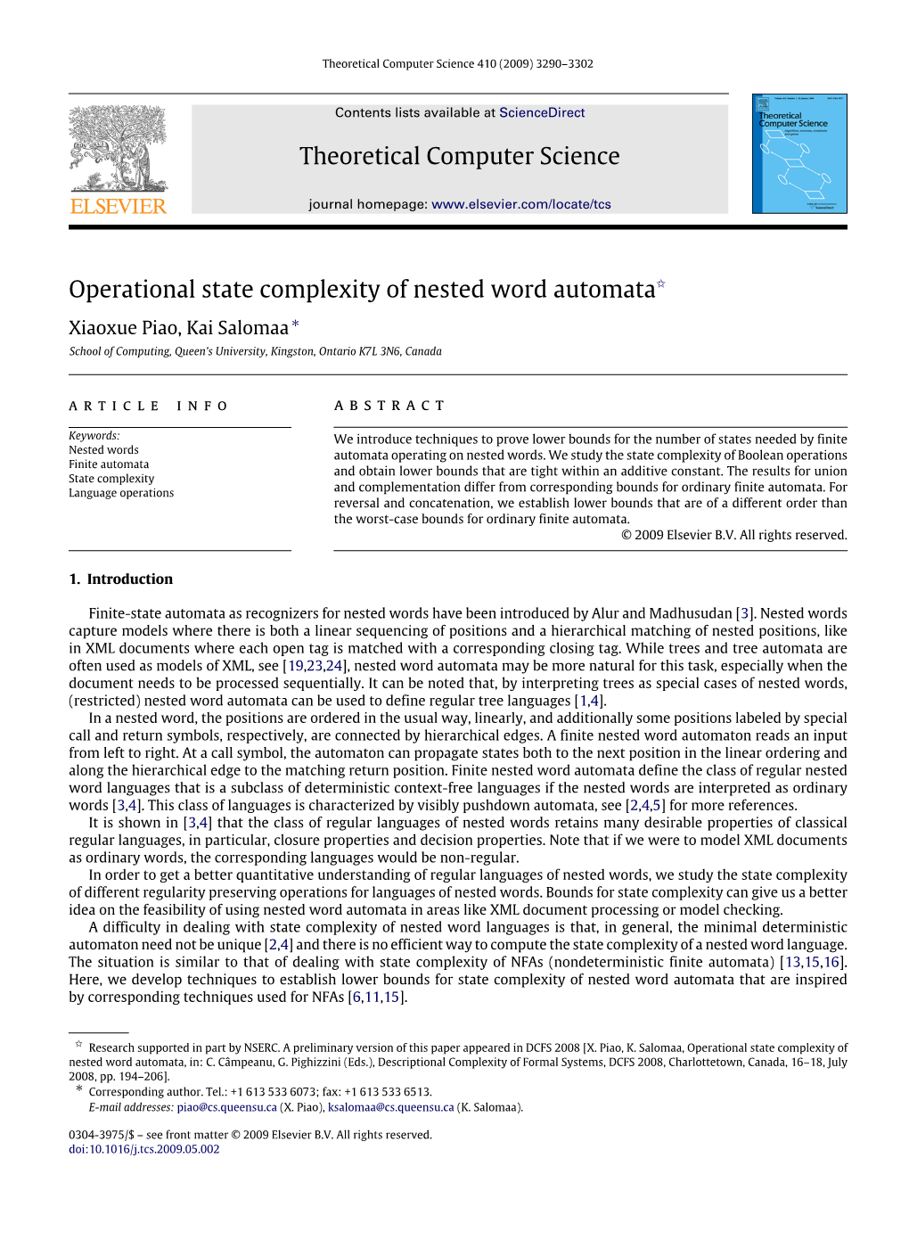 Adding Nesting Structure to Words RAJEEV ALUR University of Pennsylvania and P. Madhusudan University of Illinois at Urbana-Champaign We propose the model of nested words for representation of data with both a linear ordering and a hierarchically nested matching of items. Examples of data with such dual linear-hierarchical structure include executions of structured programs, annotated linguistic data, and HTML/XML documents. Nested words generalize both words and ordered trees, and allow both word and tree operations. We define nested word automata—finite-state acceptors for nested words, and show that the resulting class of regular languages of nested words has all the appealing the- oretical properties that the classical regular word languages enjoys: deterministic nested word automata are as expressive as their nondeterministic counterparts; the class is closed under union, intersection, complementation, concatenation, Kleene-*, prefixes, and language homomorphisms; membership, emptiness, language inclusion, and language equivalence are all decidable; and de- finability in monadic second order logic corresponds exactly to finite-state recognizability. We also consider regular languages of infinite nested words and show that the closure properties, MSO-characterization, and decidability of decision problems carry over. The linear encodings of nested words give the class of visibly pushdown languages of words, and this class lies between balanced languages and deterministic context-free languages. We argue that for algorithmic verification of structured programs, instead of viewing the program as a context- free language over words, one should view it as a regular language of nested words (or equivalently, a visibly pushdown language), and this would allow model checking of many properties (such as stack inspection, pre-post conditions) that are not expressible in existing specification logics.