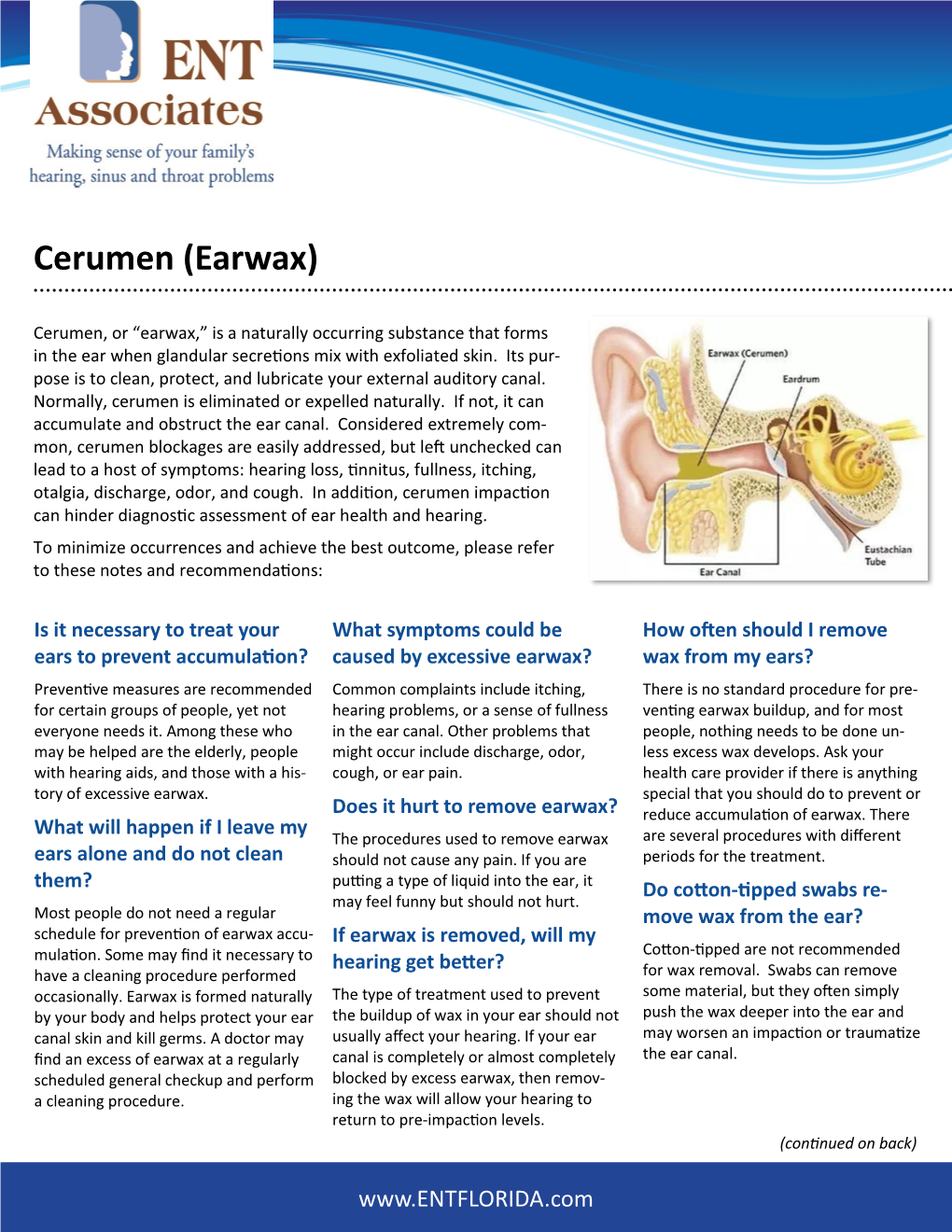 Vinod K. Anand, MD FACS Nose and Sinus Clinic EARWAX AND WHAT TO DO ABOUT IT The Outer Ear And Canal The outer ear is the funnel-like part of the ear you can see on the side of the head, plus the ear canal (the hole which leads down to the eardrum). The ear canal is shaped somewhat like an hourglass--narrowing part way down. The skin of the outer part of the canal has special glands that produce earwax. This wax is supposed to trap dust and sand particles to keep them from reaching the eardrum. Usually the wax accumulates a bit, and then dries up and comes tumbling out of the ear, carrying sand and dust with it. Or it may slowly migrate to the outside where it is wiped off. Should You Clean Your Ears? Wax is not formed in the deep part of the ear canal near the eardrum, but only in the outer part of the canal. So when a patient has wax blocked up against the eardrum, it is often because he has been probing his ear with such things as cotton-tipped applicators, bobby pins or twisted napkin corners. Such objects only serve as ramrods to push the wax in deeper. Also, the skin of the ear canal and the eardrum is very thin and fragile and is easily injured. Earwax is healthy in normal amounts and serves to coat the skin of the ear canal where it acts as a temporary water repellent. The absence of earwax may result in dry, itchy ears. -