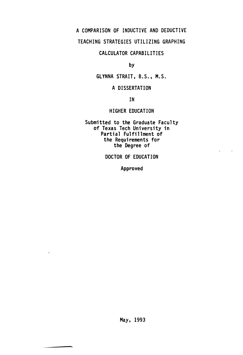 A COMPARISON of INDUCTIVE and DEDUCTIVE TEACHING STRATEGIES UTILIZING GRAPHING CALCULATOR CAPABILITIES by GLYNNA STRAIT, B.S., M.S