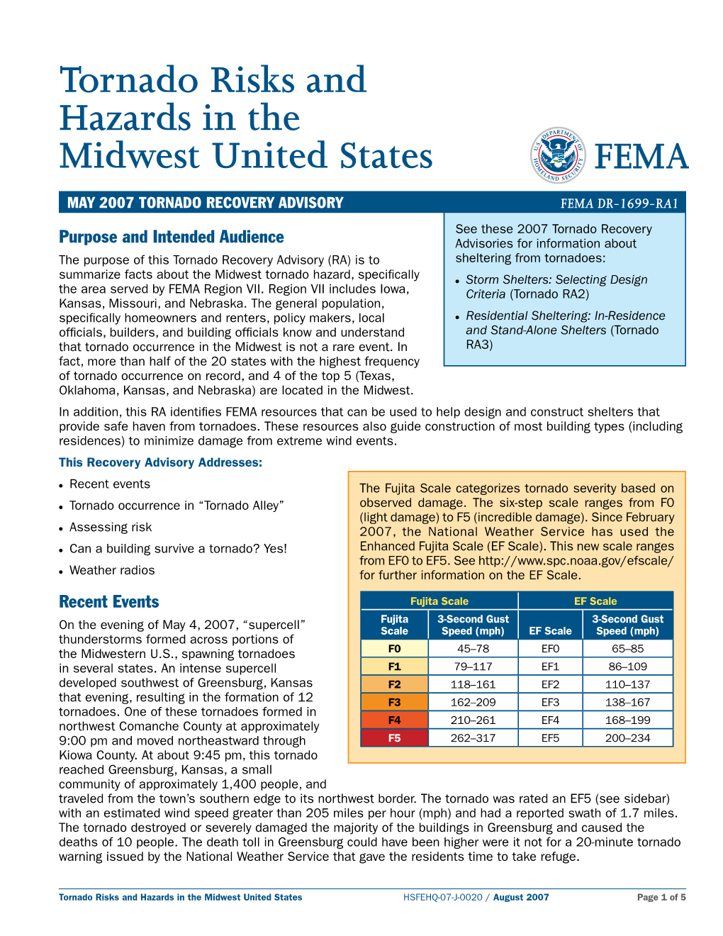 Tornado Risks and Hazards in the Southeastern United States TORNADO RECOVERY ADVISORY RA1, June 2011 Purpose and Intended Audience The purpose of this Tornado Recovery Advisory is to provide background on the tornado hazard in the Southeast. The general population, homeowners and renters, policy makers, local officials, builders, and building departments should understand that tornado occurrence in the Southeast is not a rare event. In fact, of the top 20 States in tornado frequency, 5 are in the Southeast. This advisory also identifies FEMA resources that can be used to help design and construct portions of almost any building type (including residences) to provide safe refuge from tornadoes, or to help minimize damage caused by these wind events. This Recovery Advisory Addresses: The National Weather Service uses the " Recent events Enhanced Fujita Scale (EF Scale) to categorize " Tornado occurrence outside “Tornado Alley”… tornado severity based on observed damage. how great is the risk? The scale ranges from EF0 to EF5. See http://www.spc.noaa.gov/efscale for further " Assessing your risk information on the EF Scale. " Can a building survive a tornado? Yes! EF Scale 3-Second Gust Speed (mph) " Weather radios EF0 65–85 Recent Events EF1 86–110 EF2 111–135 In the late afternoon of April 27, 2011, a large EF3 136–165 outbreak of tornadoes struck Mississippi, Tennessee, Alabama, and portions of Georgia. The EF4 166–200 National Oceanic and Atmospheric Administration EF5 Over 200 (NOAA) estimated there were approximately 190 tornadoes that touched down between 8:00 a.m. EDT April 27 and 8:00 a.m. -