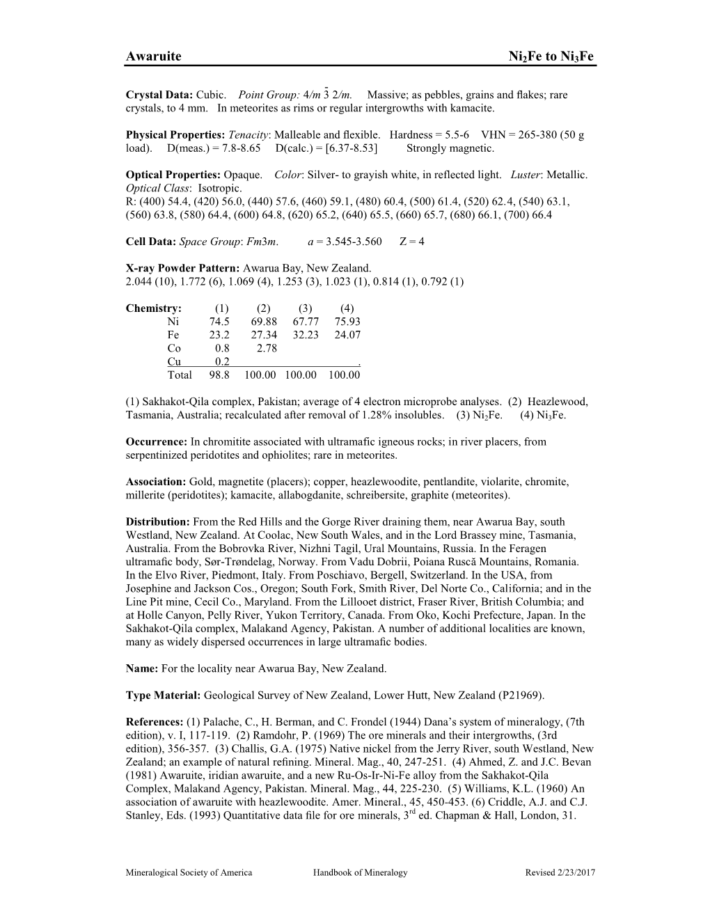 HEAZLEWOODITEANDAWARUITE IN SERPENTINITESOF THE EASTERN TOWNSHIPS,QUEBEC J. A. CnaUBERLATN Geological,Suraey of Canail,a,Ottawa Awaruite of composition approximately NiaFe was shown by Nickel (1959) to be a common accessory phase in most serpentinites of the asbestos-producing belt in the Eastern Townships, Quebec. Nickel demonstrated that awaruite developed during the serpentinization process from nickel and iron already present in these rocks. Work on the distribution and genesis of native metals in the Muskox intrusion (Chamberlain, et aI, 1965) indicated that native metals could form by the decomposition of earlier-formed sulphides. For example, pentlandite was shown to decomposeto form avraruite plus iron sulphide, and chalcopyrite to native copper plus pyrrhotite. Some native iron may have been formed by the reduction of magnetite. Such reactions suggested that awaruite in the Eastern Townships could also have been formed by the decomposition of primary sulphides. This theory was checked by examination of 44 polished sections made from samples donated by A. S. Maclaren of the Geological Survey, and from samples collected during the 1965 field season*. The observed distribution of awaruite, heazle- woodite and magnetite in these sections is summarized in Table 1. Magnetite is present in g4 per cent of the sections in amounts exceeding 0.1 per cent. Most sections contain 1 per cent or more. It occurs as threads between ghost olivine or pyroxene crystals, as discrete, weakly euhedral grains, or as rims around primary chromite crystals. It is invariably in contact with serpentine. Magnetite is believed to have formed by reaction of magnesium-iron olivine or pyroxene with water to give magnesium serpentine plus magnetite at temperatures below 550o C. -