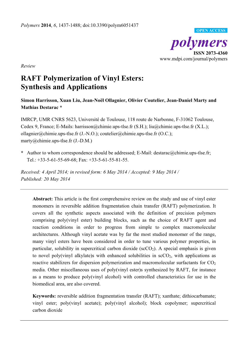 RAFT Polymerization of Vinyl Esters: Synthesis and Applications