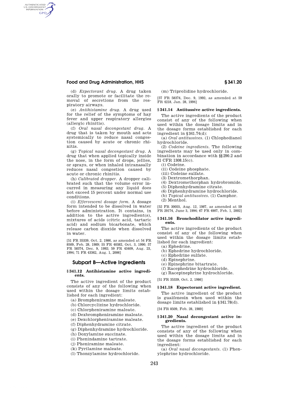 § 341.1 21 CFR Ch. I (4–1–01 Edition) 341.78 Labeling of expectorant drug prod- (g) Topical nasal decongestant drug. A ucts. drug that when applied topically inside 341.80 Labeling of nasal decongestant drug the nose, in the form of drops, jellies, products. or sprays, or when inhaled intranasally 341.90 Professional labeling. reduces nasal congestion caused by AUTHORITY: 21 U.S.C. 321, 351, 352, 353, 355, acute or chronic rhinitis. 360, 371. (h) Calibrated dropper. A dropper cali- brated such that the volume error in- Subpart A—General Provisions curred in measuring any liquid does not exceed 15 percent under normal use § 341.1 Scope. conditions. (a) An over-the-counter cold, cough, [51 FR 35339, Oct. 2, 1986, as amended at 54 FR allergy, bronchodilator, or anti- 8509, Feb. 28, 1989; 55 FR 40382, Oct. 3, 1990; 57 asthmatic drug product in a form suit- FR 58374, Dec. 9, 1992; 59 FR 43409, Aug. 23, able for oral, inhalant, or topical ad- 1994] ministration is generally recognized as safe and effective and is not mis- Subpart B—Active Ingredients branded if it meets each of the condi- tions in this part and each of the gen- § 341.12 Antihistamine active ingredi- eral conditions established in § 330.1. ents. (b) References in this part to regu- The active ingredient of the product latory sections of the Code of Federal consists of any of the following when Regulations are to chapter I of title 21 used within the dosage limits estab- unless otherwise noted. lished for each ingredient: [51 FR 35339, Oct. -