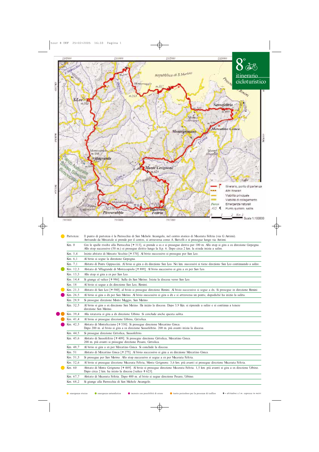 [email protected] 3. View of Monte Cerignone Monte of View 3. Provincia di Pesaro e Urbino e Pesaro di Provincia which give their names to the park the to names their give which www.turismo.pesarourbino.it 2. The rocks of Simone and Simoncello and Simone of rocks The 2. 1. View of Macerata Feltria Macerata of View 1. Cover: San Leo, the castle the Leo, San Cover: 3. alt. 986 m)… not for the weak-hearted! the for not m)… 986 alt. one particularly difficult uphill stretch (max. stretch uphill difficult particularly one with continuous climbs and descents with descents and climbs continuous with Romagna and the republic of San Marino, San of republic the and Romagna The route runs through parts of Marche, of parts through runs route The natural park of “Sasso Simone e Simoncello” e Simone “Sasso of park natural side, part of which lies inside the regional the inside lies which of part side, The tour passes through unspoilt country- unspoilt through passes tour The Piandimeleto • Mercatale • Piandimeleto S.S. 73 bis to Sant'Angelo in Vado • Vado in Sant'Angelo to bis 73 S.S. Inland: From signs for Urbino (S.P. 423) • Ca Gallo • Mercatale Mercatale • Gallo Ca • 423) (S.P. Urbino for signs Autostrada A14, Pesaro Exit • follow road follow • Exit Pesaro A14, Autostrada Coast: the From How to reach Macerata Feltria: Macerata reach to How 2. trained cyclists trained Intended for: for: Intended MONTECOPIOLO asphalt Type of road: road: of Type MONTECERIGNONE Level of difficulty: difficulty: of Level MACERATA FELTRIA MACERATA m. -