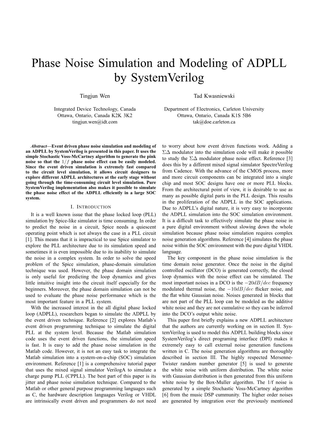 Phase Noise Simulation and Modeling of ADPLL by Systemverilog