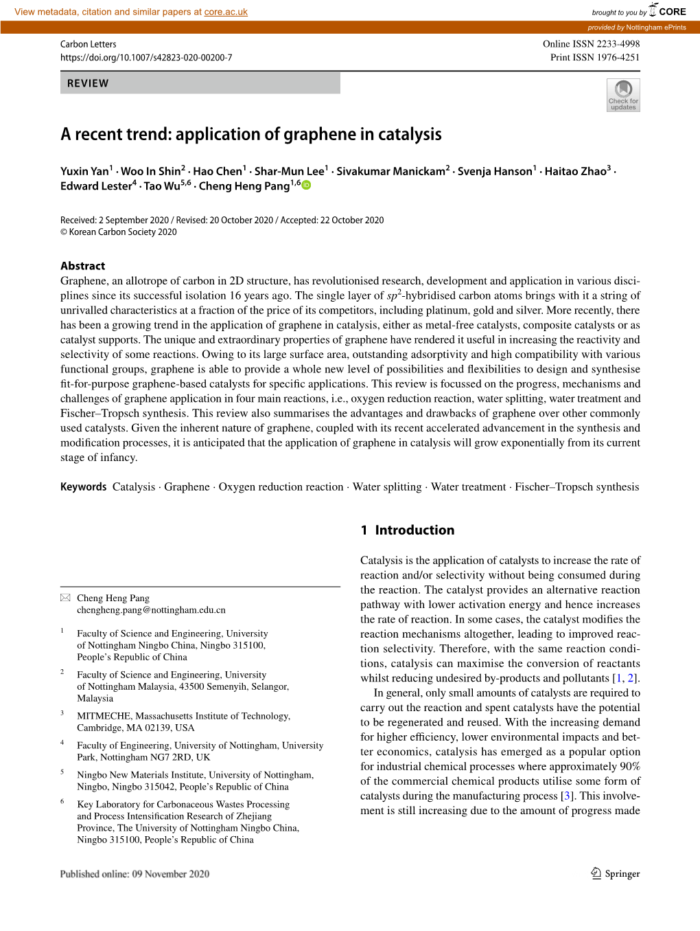 catalysts Article Reduced Graphene Oxide-Supported Pt-Based Catalysts for PEM Fuel Cells with Enhanced Activity and Stability Irina V. Pushkareva 1,2 , Artem S. Pushkarev 1,2,3 , Valery N. Kalinichenko 2,4,5, Ratibor G. Chumakov 2,3, Maksim A. Soloviev 1,2, Yanyu Liang 6, Pierre Millet 7 and Sergey A. Grigoriev 1,2,8,* 1 National Research University “Moscow Power Engineering Institute”, 14, Krasnokazarmennaya st., 111250 Moscow, Russia; [email protected] (I.V.P.); [email protected] (A.S.P.); [email protected] (M.A.S.) 2 National Research Center “Kurchatov Institute”, 1, Akademika Kurchatova sq., 123182 Moscow, Russia; [email protected] (V.N.K.); [email protected] (R.G.C.) 3 Moscow Institute of Physics and Technology, 9, Institutskiy per., Dolgoprudny, 141701 Moscow Region, Russia 4 N.N. Semenov Federal Research Center for Chemical Physics, Russian Academy of Sciences, 119991 Moscow, Russia 5 N.M. Emanuel Institute of Biochemical Physics, Russian Academy of Sciences, 119991 Moscow, Russia 6 College of Materials Science and Technology, Nanjing University of Aeronautics and Astronautics, Nanjing 211106, China; [email protected] 7 Institut de Chimie Moléculaire et des Matériaux d’Orsay, Université Paris-Saclay, 91405 Orsay, France; [email protected] 8 HySA Infrastructure Center of Competence, Faculty of Engineering, North-West University, Potchefstroom 2531, South Africa * Correspondence: [email protected] or [email protected] Citation: Pushkareva, I.V.; Pushkarev, A.S.; Kalinichenko, V.N.; Abstract: Platinum (Pt)-based electrocatalysts supported by reduced graphene oxide (RGO) were Chumakov, R.G.; Soloviev, M.A.; synthesized using two different methods, namely: (i) a conventional two-step polyol process using Liang, Y.; Millet, P.; Grigoriev, S.A. -