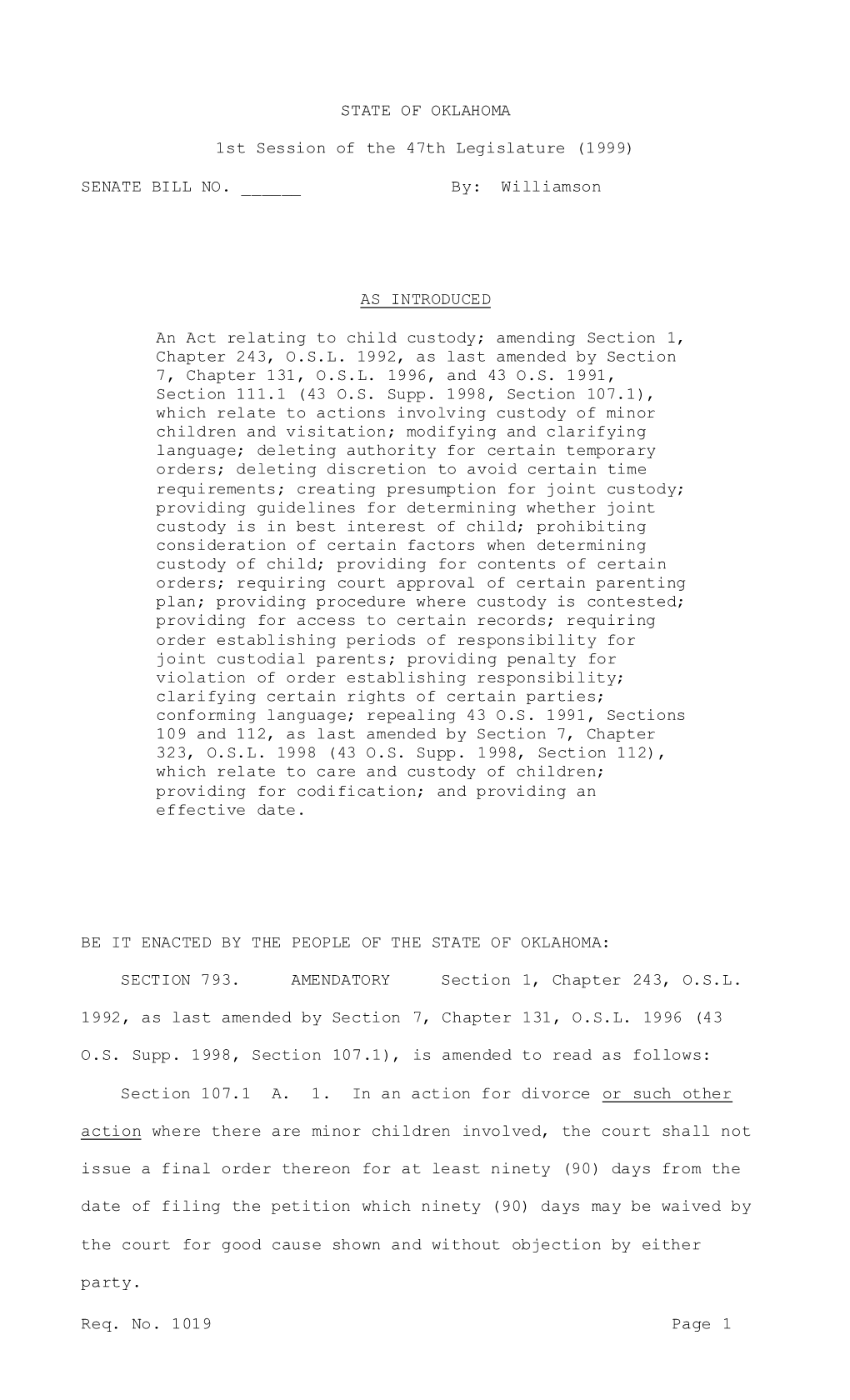 \\jciprod01\productn\M\MAT\25-2\MAT205.txt unknown Seq: 1 9-APR-13 7:14 Vol. 25, 2013 Best Interests of the Child 311 Best Interests of the Child – A Legislative Journey Still in Motion by Erin Bajackson* Little argument exists among scholars that the current model used in custody cases, the “best interests of the child” standard, has at least as many weaknesses as it does strengths. At best it can be described as a fact-driven process that most accurately protects a child’s physical, psychological, and emo- tional needs.1 At worst it has been deemed an egocentric, utilita- rian product of the state’s design to make children productive members of society rather than burdens upon it later in life.2 The truth most likely lies somewhere in the vast distance between the two extremes—a different spot on the spectrum for each state that relies largely upon its own judicial interpretation of a guide- line exceedingly vague in nature. What may be more largely agreed upon is that this guideline, outlined in section 402 of the Uniform Marriage and Divorce Act (hereinafter “the Act” or “UMDA”) to give children a voice in the custody process, has sparked a firestorm of legislation calling into question just who should be the focus of the standard. At issue is whose rights – those of the children or the parents – should be of paramount consideration. Does the benefit of a meaningful and lasting relationship with both parents in most cases substantiate a presumption of joint custody? * American Academy of Matrimonial Law Journal Staff Member, J.D. -