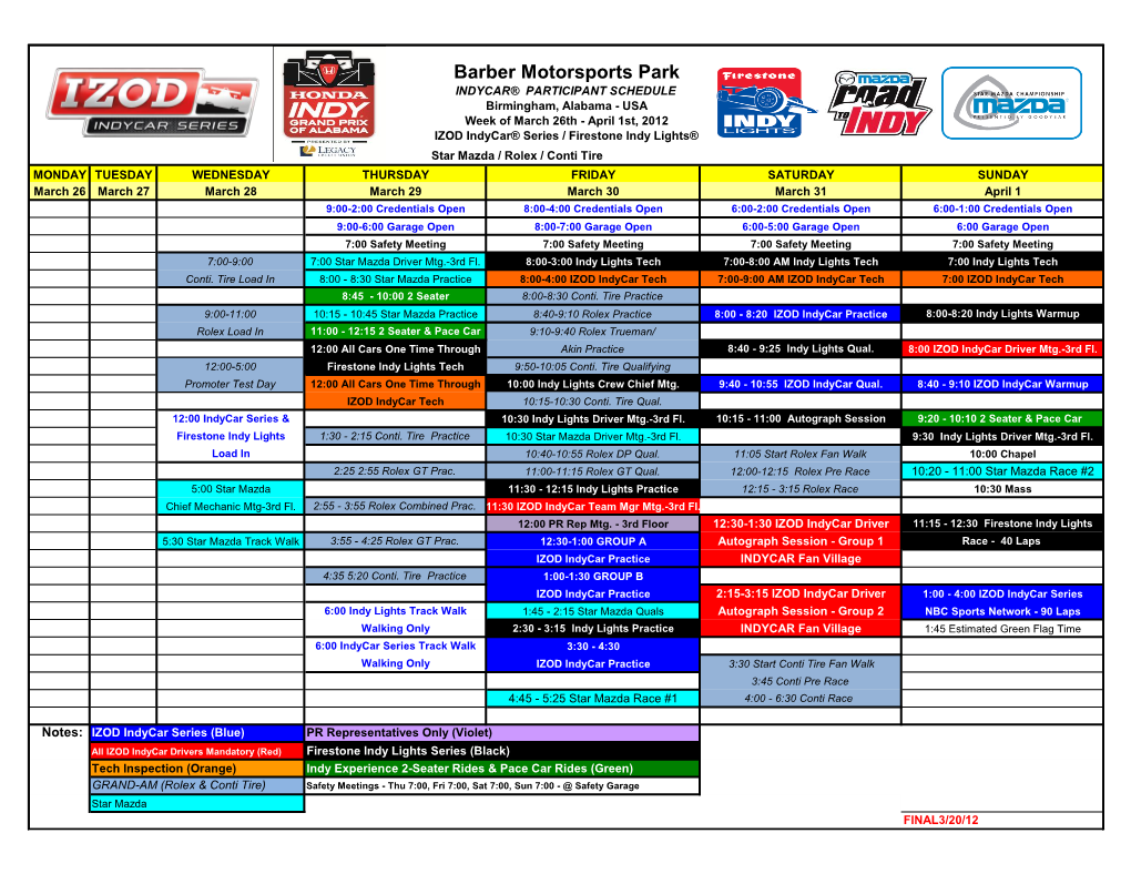 SVRA Lime Rock SpeedTour SVRA Lime Rock Park, Lakeville, CT May 28 – 31, 2021 Provisional Race Schedule Track Length: 1.5 miles 5/23/21 Thursday, May 27 Saturday, May 29, cont. 12:00pm - 6:00pm Registration 3:30pm Groups 10, IGT Qualifying 12:00pm - 6:00pm Load-in – Instructions available at: 4:00pm TA2® Practice 30min https://svra.com/wp-content/uploads/2021/05/Load-in- 4:30pm End of on-track activities Instructions.pdf - GATES CLOSE AT 6PM TRACK WALK 4:30PM-6:00PM Sunday, May 30 10:00am – 3:00pm Royal’s Car Show Presented by Hagerty Friday, May 28 7:00am – 5:00pm Registration Monday, May 31 7:30am – 5:00pm Tech Inspection 8:00am—12 noon Registration 8:45am Mandatory Drivers Meeting Video – SVRA 9:05am TA2® Qualifying 20min Admin trailer (for those who didn’t complete virtual mtg) 9:30am Groups 1, 2, 3, 4, Miata Feature Race 1 10:05am Group A 10:00am Groups 10, IGT Feature Race 1 10:30am Group B 10:30am Groups 6, 8, 12 Feature Race 1 10:55am Group C 11:00am Groups 5, 7, 9, 11 Feature Race 1 11:20am Group D 11:45am TA/XGT/SGT/GT (Optional Test Session) 11:30am - 12:30pm Memorial Day Endurance Challenge 12:30pm Group A 60min Closed Wheel Only 1 pit stop 12:55pm Group B 12:30pm - 1:30pm LUNCH BREAK - PARADE LAPS 1:20pm—2:20pm LUNCH BREAK 1:30pm TA2® Feature Race 65min 2:20pm Group C 2:40pm Groups 1, 2, 3, 4, Miata Feature Race 2 2:45pm Group D 3:10pm Groups 10, IGT Feature Race 2 3:10pm TA/XGT/SGT/GT (Practice 30min) 3:40pm Groups 6, 8, 12 Feature Race 2 3:40pm Group A 4:10pm Groups 5, 7, 9, 11 Feature Race 2 4:05pm Group B 4:40pm End of -