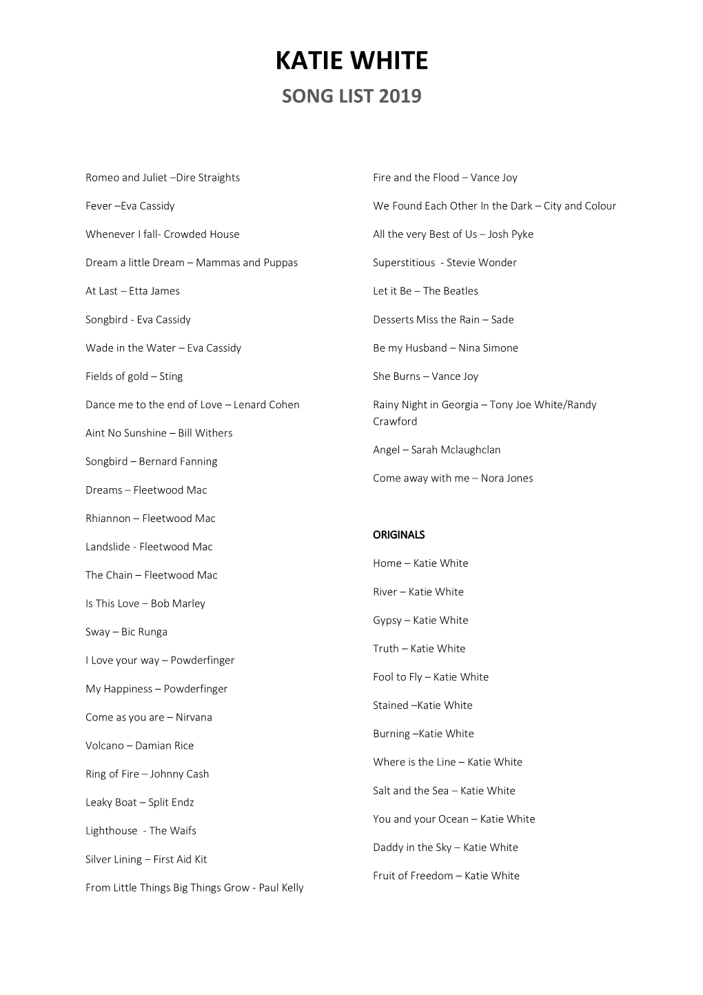 ACOUSTIC AVENUE DUO/TRIO SONG LIST This list does not include all songs performed Aint Seen Nothin Yet Bachman Turner Leaving On a Jet Plane Bob Dylan Across The Universe The Beatles Mr Jones Counting Crows Ain’t No Sunshine Bill Withers My Happiness Powderfinger All I Have To Do The Everly Brothers Mrs. Robinson Simon and Garfunkle Amazing Alex Lloyd Open Your Eyes Snow Patrol Another Lonely Day Ben Harper Only Wanna be with you Hootie and The Blowfish April Sun Dragon Peaches and Cream John Butler Trio Better Be Home Soon Crowded House Purple Sneakers You Am I Better Man Pearl Jam Put Your Records On Corinne Bailey Rae Breakfast at Tiffanys Deep Blue Something Passenger Powderfinger Boys Light Up Australian Crawl Pictures Sneaky Sound System Baby I Love Your Way Pater Frampton Run To Paradise The Choirboys Bad Moon Rising CCR Steal My Kisses Ben Harper Brown Eyed Girl Van Morrison Summer Of 69 Bryan Adams Black Finger Nails Eskimo Joe Save Tonight Eagle Eye Cherry Clocks Coldplay Somebody Told Me The Killers Cherry Bomb John Mellencamp Stuck In The Middle Steelers Wheel Dumb Things Paul Kelly Strong Enough Sheryl Crow Drugs Don’t Work The Verve Sitting On The Dock Otis Redding Down Hearted Australian Crawl Suddenly I see KT Tunstall Don’t Dream Its Over Crowded House Something So Strong Crowded House Dreams Fleetwood Mac Shot Through The Heart Bon Jovi Daydream Believer The Monkeys Take It Easy The Eagles Don’t Look Back Oasis 20 Good Reasons Thirsty Merc Don’t Stop Fleetwood Mac Throw Your Arms Hunters and Collectors Down On The Corner -