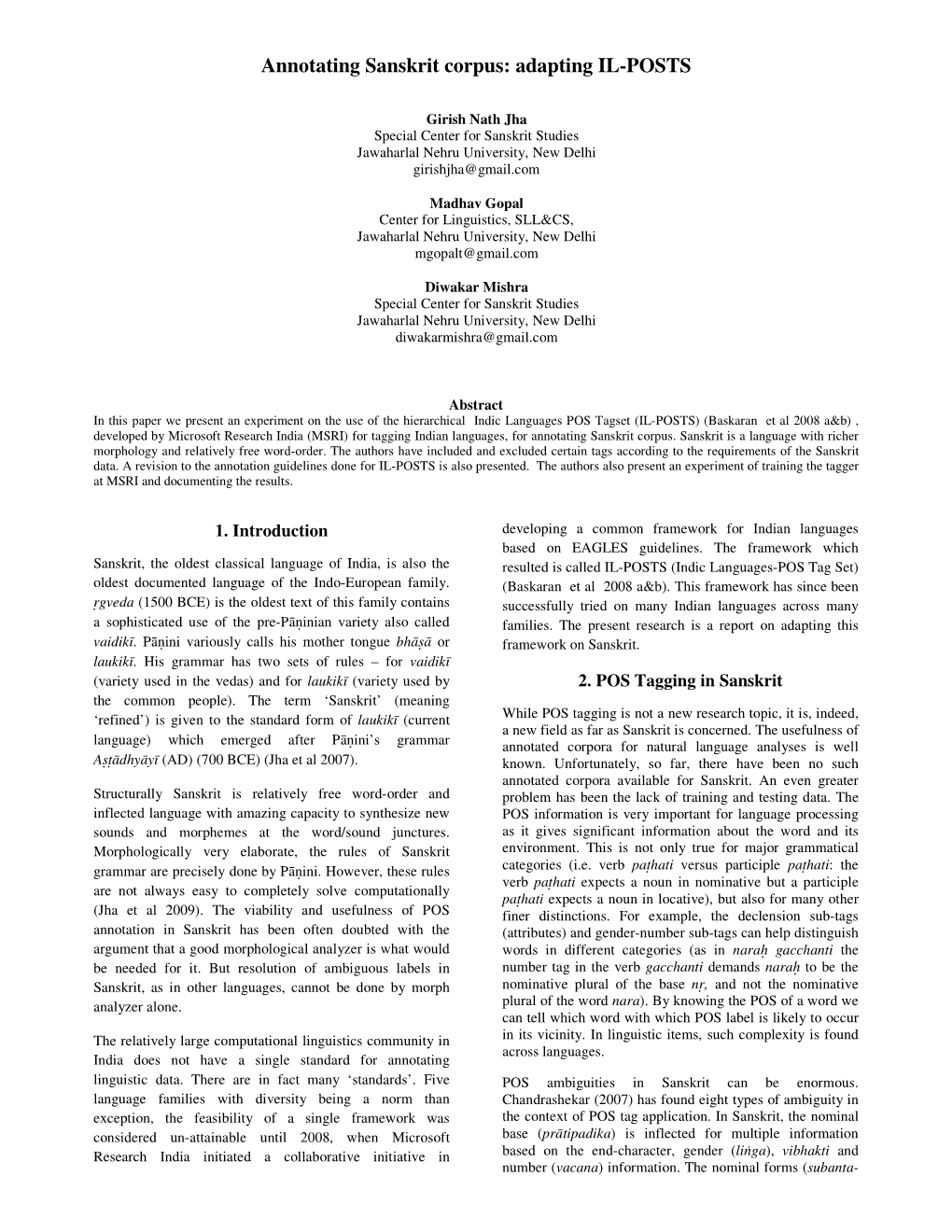 Inflectional Morphology Analyzer for Sanskrit Girish Nath Jha, Muktanand Agrawal, Subash, Sudhir K. Mishra, Diwakar Mani, Diwakar Mishra, Manji Bhadra, Surjit K. Singh [email protected] Special Centre for Sanskrit Studies Jawaharlal Nehru University New Delhi-110067 The paper describes a Sanskrit morphological analyzer that identifies and analyzes inflected noun- forms and verb-forms in any given sandhi-free text. The system which has been developed as java servlet RDBMS can be tested at http://sanskrit.jnu.ac.in (Language Processing Tools > Sanskrit Tinanta Analyzer/Subanta Analyzer) with Sanskrit data as unicode text. Subsequently, the separate systems of subanta and ti anta will be combined into a single system of sentence analysis with karaka interpretation. Currently, the system checks and labels each word as three basic POS categories - subanta, ti anta, and avyaya. Thereafter, each subanta is sent for subanta processing based on an example database and a rule database. The verbs are examined based on a database of verb roots and forms as well by reverse morphology based on Pāini an techniques. Future enhancements include plugging in the amarakosha ( http://sanskrit.jnu.ac.in/amara ) and other noun lexicons with the subanta system. The ti anta will be enhanced by the k danta analysis module being developed separately. 1. Introduction The authors in the present paper are describing the subanta and ti anta analysis systems for Sanskrit which are currently running at http://sanskrit.jnu.ac.in . Sanskrit is a heavily inflected language, and depends on nominal and verbal inflections for communication of meaning. A fully inflected unit is called pada . -