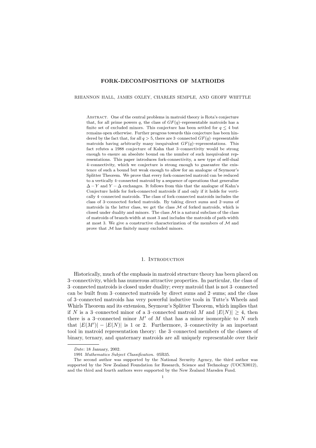 On the graphic matroid parity problem Zolt´an Szigeti∗ Abstract A relatively simple proof is presented for the min-max theorem of Lov´asz on the graphic matroid parity problem. 1 Introduction The graph matching problem and the matroid intersection problem are two well-solved problems in Combi- natorial Theory in the sense of min-max theorems [2], [3] and polynomial algorithms [4], [3] for finding an optimal solution. The matroid parity problem, a common generalization of them, turned out to be much more difficult. For the general problem there does not exist polynomial algorithm [6], [8]. Moreover, it contains NP-complete problems. On the other hand, for linear matroids Lov´asz provided a min-max formula in [7] and a polynomial algorithm in [8]. There are several earlier results which can be derived from Lov´asz’ theorem, e.g. Tutte’s result on f-factors [15], a result of Mader on openly disjoint A-paths [11] (see [9]), a result of Nebesky concerning maximum genus of graphs [12] (see [5]), and the problem of Lov´asz on cacti [9]. This latter one is a special case of the graphic matroid parity problem. Our aim is to provide a simple proof for the min-max formula on this problem, i. e. on the graphic matroid parity problem. In an earlier paper [14] of the present author the special case of cacti was considered. We remark that we shall apply the matroid intersection theorem of Edmonds [4]. We refer the reader to [13] for basic concepts on matroids. For a given graph G, the cycle matroid G is defined on the edge set of G in such a way that the independent sets are exactly the edge sets of the forests of G. -