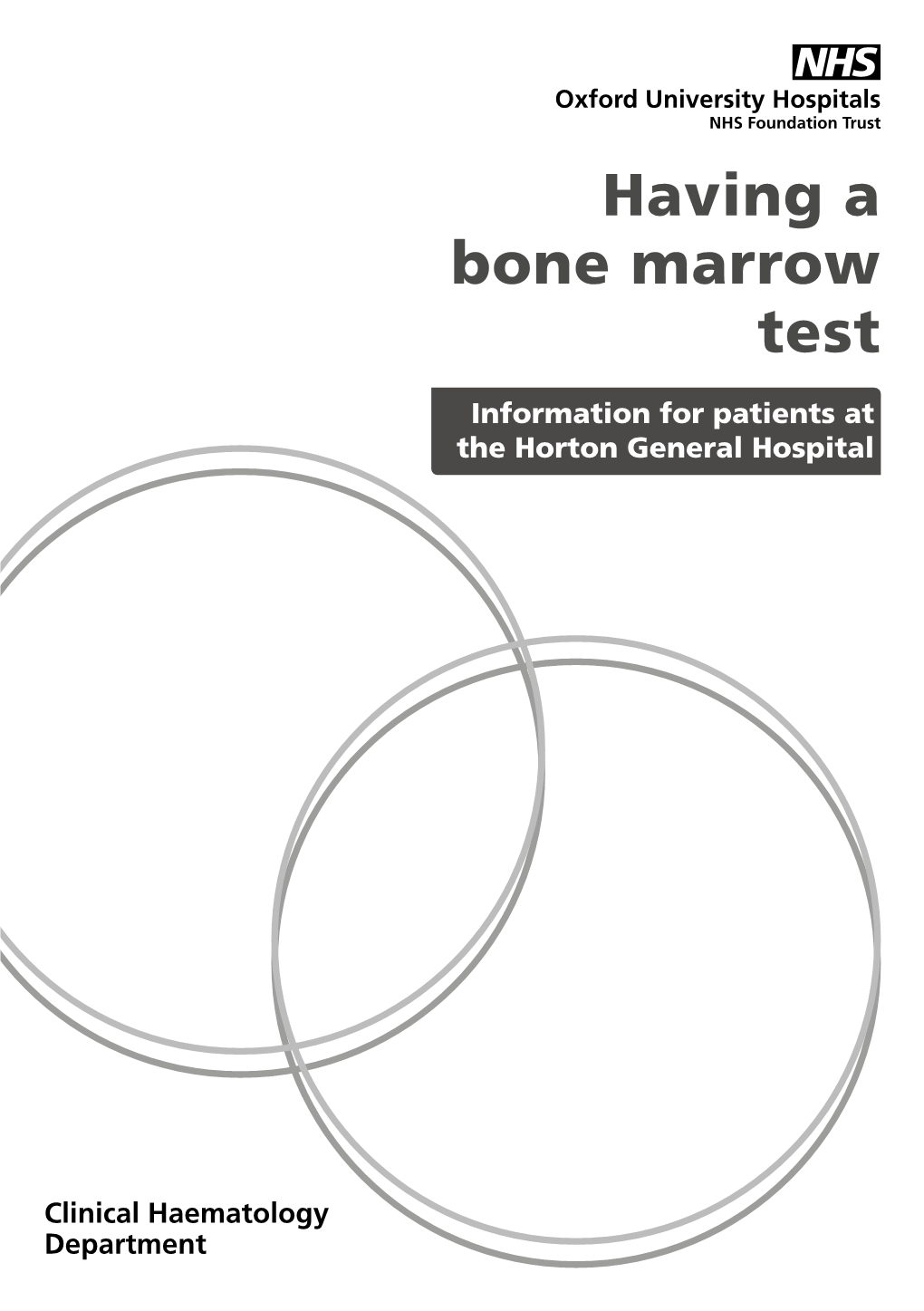 Having a bone marrow test Information for patients at the Horton General Hospital Clinical Haematology Department Page 2 You may find this leaflet helpful if you or someone close to you is going to have a bone marrow test. It explains: • what bone marrow is; • what a bone marrow test is and why you might need one; • what a bone marrow test involves. What is bone marrow? Bone marrow is a sponge-like material found inside certain bones of the body. Blood cells are made in the bone marrow. Blood is made up of three main types of cells: red blood cells, white blood cells and platelets. Disorders affecting any of these cell types can be assessed by examining a sample of the bone marrow. What is a bone marrow test? In a bone marrow test a sample of bone marrow is taken from inside the bone. This is usually taken from the back of the pelvic bone as there is a good supply of bone marrow here and it is usually easy to reach. The sample can then be examined under a microscope in a laboratory. Why do I need a bone marrow test? Some of your symptoms or abnormalities on your blood tests suggest that there might be a problem with the way your blood cells are made. A bone marrow test provides different information to a blood test. It provides important information about your condition. It might also help to decide on the best treatment for your condition. Ask your doctor or clinical nurse specialist if you have any questions about the reasons for your bone marrow biopsy. Page 3 How is the bone marrow test done? The doctor will discuss the procedure with you. This will give you an opportunity to ask questions. You will be asked to sign a consent form. You will be asked to lie on your side with your knees bent up and your clothing loosened to expose your back at the top of your pelvic bone. Your skin will be cleaned with an antiseptic solution. Local anaesthetic will then be injected into the skin over the back of the pelvic bone to numb the area where the sample is to be taken. Once the area is numb, a needle will be passed through the skin into the bone and a sample of liquid marrow will be drawn up into the syringe. This is called a bone marrow aspirate. Sometimes a second needle is used to take another sample of the more solid bone marrow tissue. This is called a bone marrow trephine or biopsy. A small dressing will be placed over the site. Please wait 24 hours before removing the dressing or bathing the area. You will be asked to rest for around half an hour after the test is finished. The doctor will check your dressing and explain how to care for yourself after the test. You will then be able to go home. Page 4 Does it hurt? We aim to make the procedure as pain free as possible. The local anaesthetic causes a mild stinging sensation before the skin starts to feel numb. Some patients report a brief sharp pain as the bone marrow is drawn into the syringe. This pain does not last for more than a few seconds. If you have a bone marrow trephine, there may be a dull ache afterwards. As the local anaesthetic wears off after an hour or so, many patients feel a bruised or aching sensation over the site of the biopsy. This is usually relieved by taking paracetamol. Will I be able to drive home? You will be able to drive yourself home. You may prefer to bring someone to be with you on the day and drive you home. You will be advised to avoid any strenuous exercise for a day or so after the procedure. Do I need to bring someone with me? It is not necessary to bring someone with you. However, some people find it reassuring to have another person with them. Page 5 Are there any risks? As with any procedure involving a tissue biopsy, there is a small risk of bleeding from the puncture site. There may be an increased risk of bleeding if you are taking medications to thin your blood. If you are on aspirin, warfarin, clopidogrel, apixaban or any other blood thinners, please call us as soon as possible on the number at the end of this leaflet. We can discuss whether your medicine should be stopped temporarily in the week before the bone marrow test. There is also a small risk that the needle puncture site could become infected after the procedure. We take extreme care to keep the procedure sterile to minimize this risk. Sometimes we will not be able to take a sample. If this happens, the procedure might need to be repeated. We will ask your permission to repeat the procedure. Medication It is important to tell the doctor about any tablets or injections you are taking, as they may have to be stopped for a short while before having the test. This is especially important for medications that thin your blood, including warfarin. Page 6 How long does it take? It usually takes about 10-15 minutes to take the sample. You should allow up to one and a half hours for the procedure. This is because we need to allow time for you to sign a consent form beforehand. We will also ask you to stay for 30 minutes after the procedure to make sure you feel well enough to go home. This also gives the doctor time to check your dressing and give you advice about how to care for the wound and what happens next. Please report to Pathology Reception on arrival. Where is it done? The test is done in the Pathology Department at the Horton General Hospital. Please report to Pathology Reception on arrival. When will I get the results? This will depend on what sort of test you have. Bone marrow aspirate results may be available approximately two days after the procedure. Bone marrow trephine results can take longer. It might take more than ten days for these results to be available. You will usually be given the results of the test at your next appointment. We realize that it is a stressful time waiting for results, so your doctor will let you know as soon as possible. Page 7 Research You may be asked if some of your marrow sample can be used for research. If you agree you will be asked to sign another consent form. Your doctor will be happy 