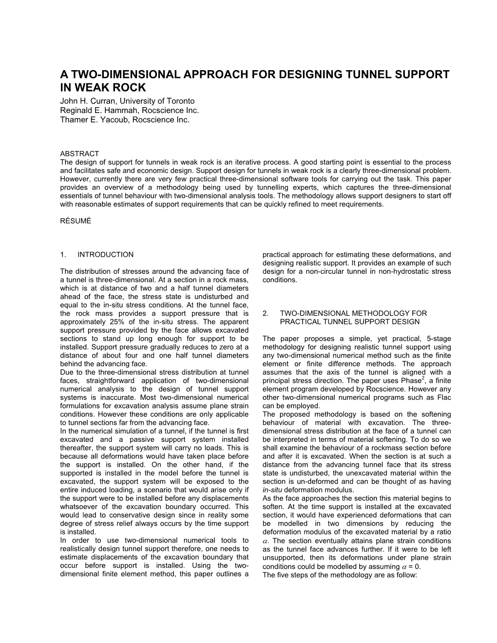 A TWO-DIMENSIONAL APPROACH for DESIGNING TUNNEL SUPPORT in WEAK ROCK John H