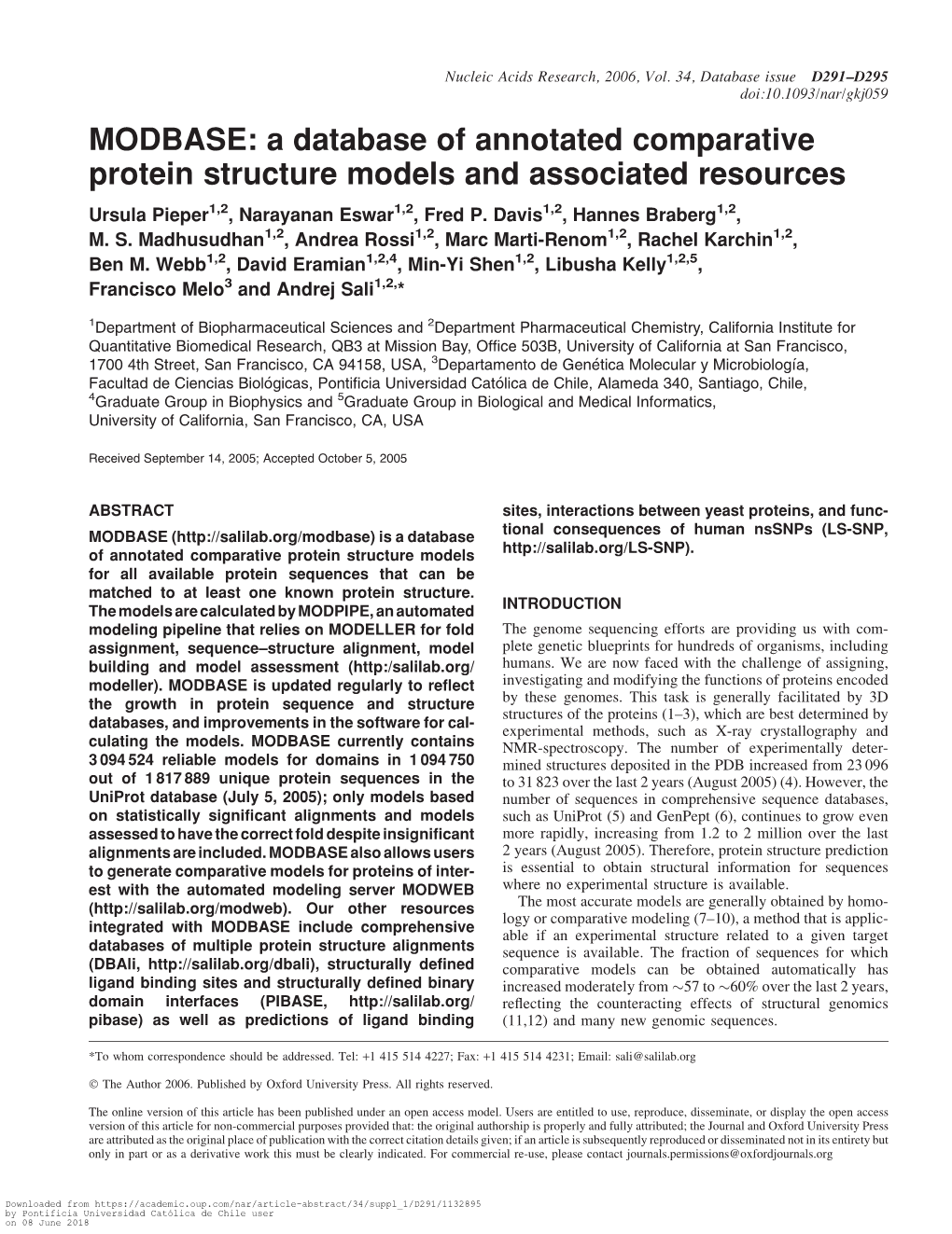 MODBASE: a Database of Annotated Comparative Protein Structure Models and Associated Resources Ursula Pieper1,2, Narayanan Eswar1,2, Fred P