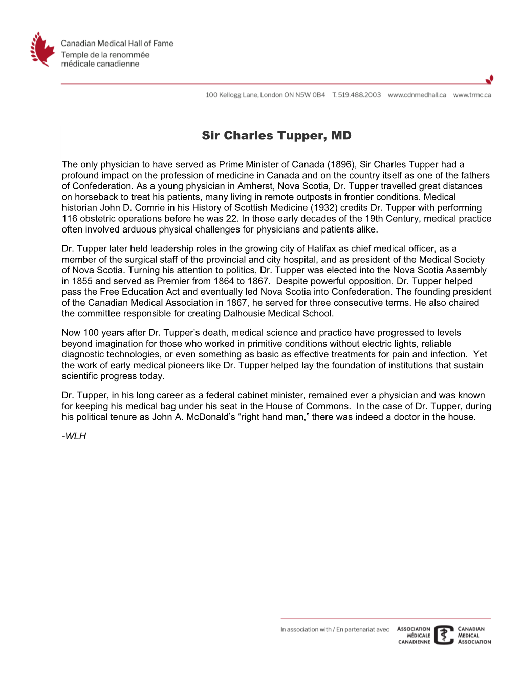 1 Sir Charles Tupper Canada’s sixth prime minister Quick Facts Term(s) of Office: May 1, 1896–July 8, 1896 Born July 2, 1821, Amherst, Nova Scotia Died October 30, 1915, Bexley Heath, England Grave site: St. John's Cemetery, Halifax, Nova Scotia Education University of Edinburgh, Scotland, M.D. 1843 Personal Life Married 1846, Frances Morse (1826–1912) Three sons, three daughters Occupations Physician 1867–1870 President, Canadian Medical Association Author Political Party Conservative 1896–1901 Party Leader Constituencies 1867–1884, 1887–1888 Cumberland, Nova Scotia 1896–1900 Cape Breton, Nova Scotia Other Ministries 1857–1860, 1863–1867 Provincial Secretary (Province of Nova Scotia) 1870–1872 President of the Privy Council 1872–1873 Inland Revenue 1873 Customs 1878–1879 Public Works 1879–1884 Railways and Canals 1887–1888 Finance 1896 Secretary of State of Canada 2 Political Record Premier of Nova Scotia 1864–1867 Participant in the Confederation Conferences of Charlottetown 1864, Quebec 1864, and London 1866 Father of Confederation 1867 Construction of the Canadian Pacific Railway 1879–1884 High Commissioner to the United Kingdom 1884–1887, 1888–1896 Leader of the Opposition 1896–1901 Biography The human mind naturally adapts itself to the position it occupies. The most gigantic intellect may be dwarfed by being cabin'd, cribbed and confined. It requires a great country and great circumstances to develop great men.—Charles Tupper, 1865 By reason of his personal skills and experience, no one had greater qualification to be prime minister than Charles Tupper. It is one of the strange quirks of fate and Canadian history that he served the shortest term of office of any prime minister. -