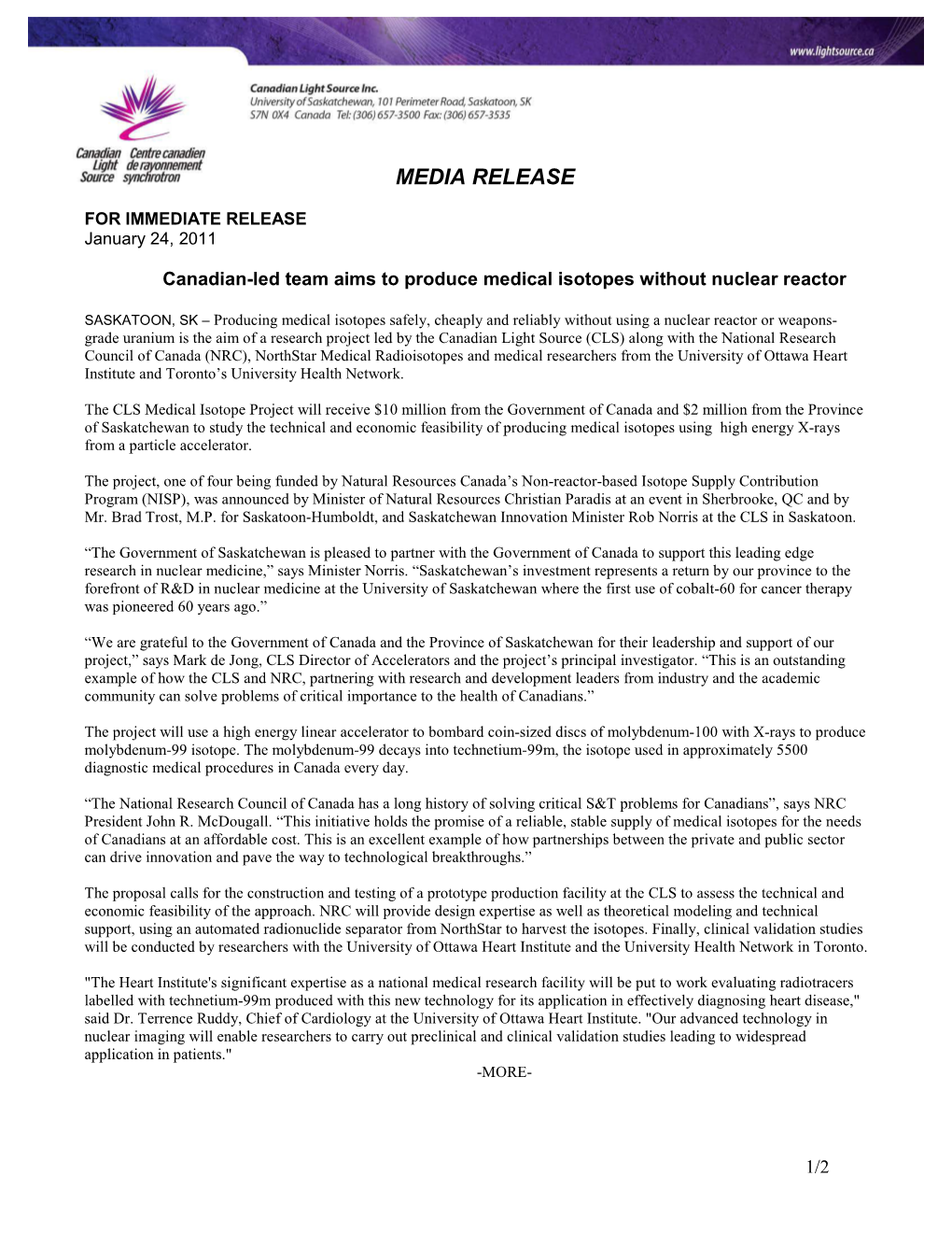 Protocol for the Medical Isotope Project Canadian Light Source Inc. Canadian Nuclear Safety Commission February 2011 CNSC FILE # 2.03 E-Docs #3645315 TABLE OF CONTENTS Summary of Changes .................................................................................................................................... i Extent of the Protocol................................................................................................................................... ii 1. Introduction......................................................................................................................................... 1 2. Objective.............................................................................................................................................. 1 3. Approach to Licensing........................................................................................................................ 1 4. Schedule ............................................................................................................................................... 2 5. Parties and Organizational Representatives..................................................................................... 2 6. Statement of Work.............................................................................................................................. 3 Project requirements.................................................................................................................................... 3 (a) Project description for -