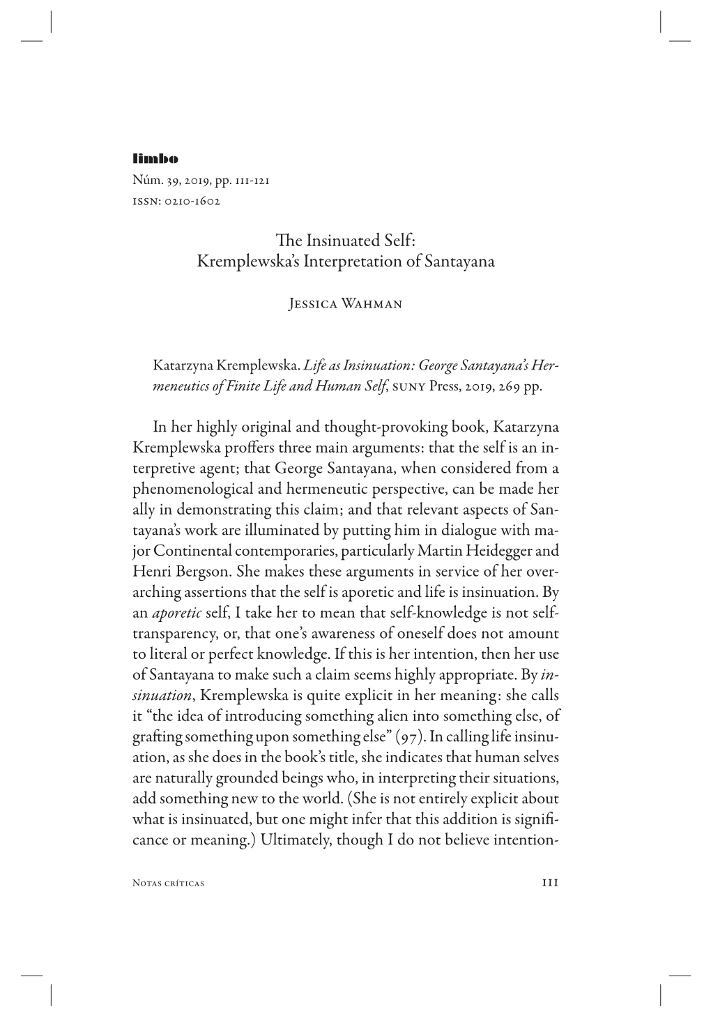 limbo Núm. 39, 2019, pp. 27-46 issn: 0210-1602 Santayana’s Locke Peter R. Anstey Abstract In 1932 Santayana delivered a tercentennial lecture on the English philoso- pher John Locke. It is the longest sustained discussion of Locke’s philoso- phy in Santayana’s writings and its interest lies not only in what it reveals about the philosophical reception of Locke in the inter-war period, but al- so about Santayana’s own understanding of the history of philosophy and his own philosophical proclivities. Th is article sets out the broader con- text within which the lecture was written and delivered, and provides an analysis of Santayana’s interpretation of Locke’s views on natural philoso- phy and the theory of ideas. Keywords: Atomism, Boyle, John Bull, Empiricism, James Gibson, Ideal- ism, Ideas, Locke, Materialism, Naturalism Resumen Santayana conmemoró el tercer centenario del nacimiento del fi lósofo in- glés John Locke en 1932. Su conferencia constituye la discusión más larga mantenida sobre la fi losofía de Locke que aparece en la obra de Santayana, interesante no solo por lo que revela sobre la recepción fi losófi ca de Locke en el periodo de entreguerras, sino también sobre la historia de la fi losofía del propio Santayana y sobre su talante fi losófi co. El artículo establece el amplio contexto en que fue dada y escrita la conferencia y aporta un aná- lisis de la interpretación por Santayana de las opiniones lockeanas sobre fi losofía natural y sobre la teoría de las ideas. Simposio sobre la historia de la filosofía de Santayana 27 28 Peter R. -