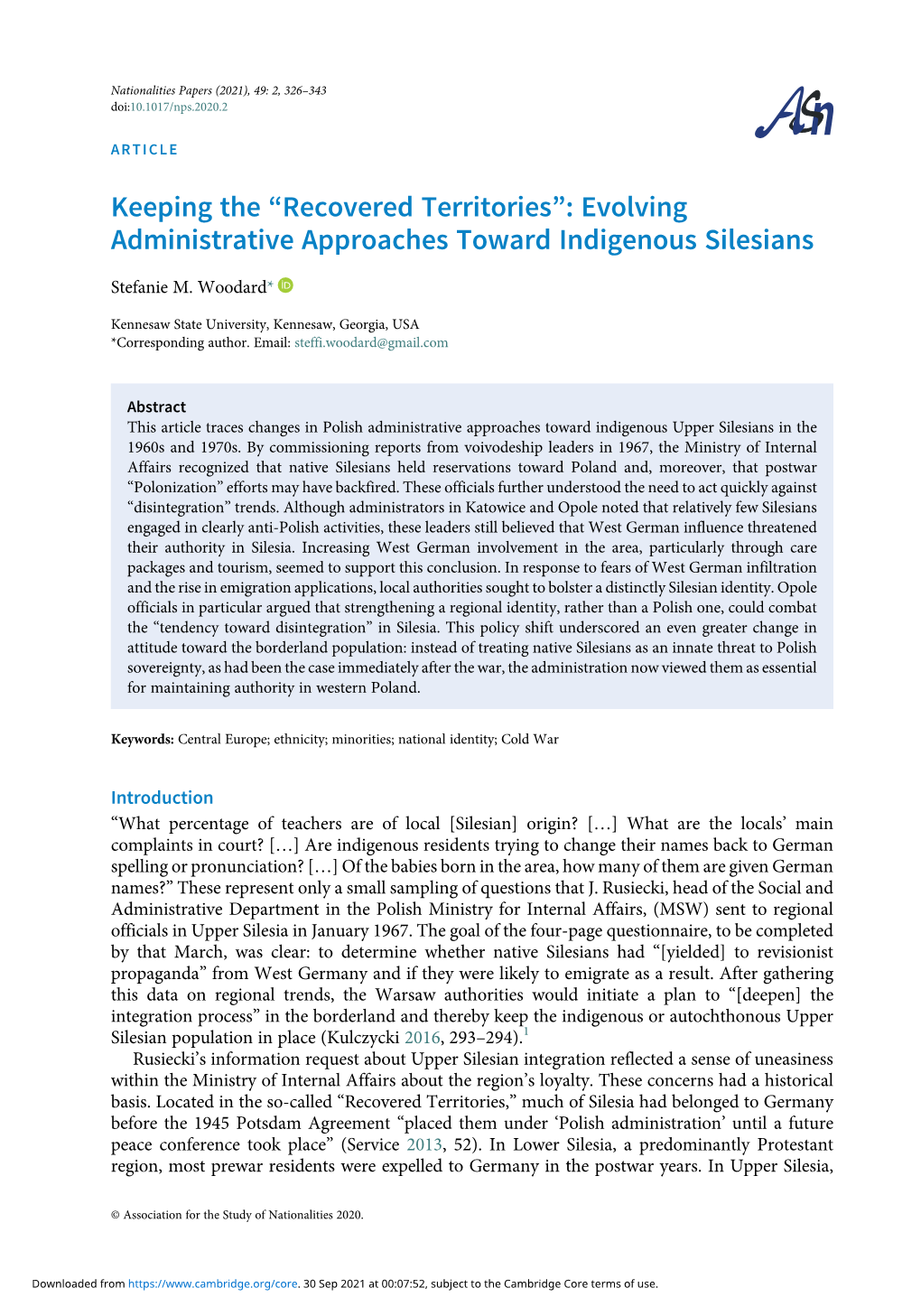 Nationalities Papers (2021), 49: 2, 326–343 doi:10.1017/nps.2020.2 ARTICLE Keeping the “Recovered Territories”: Evolving Administrative Approaches Toward Indigenous Silesians Stefanie M. Woodard* Kennesaw State University, Kennesaw, Georgia, USA *Corresponding author. Email: [email protected] Abstract This article traces changes in Polish administrative approaches toward indigenous Upper Silesians in the 1960s and 1970s. By commissioning reports from voivodeship leaders in 1967, the Ministry of Internal Affairs recognized that native Silesians held reservations toward Poland and, moreover, that postwar “Polonization” efforts may have backfired. These officials further understood the need to act quickly against “disintegration” trends. Although administrators in Katowice and Opole noted that relatively few Silesians engaged in clearly anti-Polish activities, these leaders still believed that West German influence threatened their authority in Silesia. Increasing West German involvement in the area, particularly through care packages and tourism, seemed to support this conclusion. In response to fears of West German infiltration and the rise in emigration applications, local authorities sought to bolster a distinctly Silesian identity. Opole officials in particular argued that strengthening a regional identity, rather than a Polish one, could combat the “tendency toward disintegration” in Silesia. This policy shift underscored an even greater change in attitude toward the borderland population: instead of treating native Silesians -