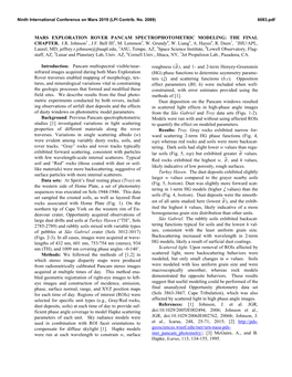 44th Lunar and Planetary Science Conference (2013) 1286.pdf SMECTITES ON CAPE YORK, MATIJEVIC HILL, MARS, AS OBSERVED AND CHARACTERIZED BY CRISM AND OPPORTUNITY. R. Arvidson1, K. Bennett1, J. Catalano1, A. Fraeman1, R. Gellert2, E. Guinness1, R. Morris3, S. Murchie4, M. Smith5, S. Squyres6, and M. Wolff7, 1Earth and Planetary Sciences, Washington University in Saint Louis, Saint Louis, MO, 63130, [email protected], 2University of Guelph, Ontario, Canada, 3NASA/JSC, Houston, TX, 4JHU/APL, Laurel, MD, 5NASA/GSFC, Green- belt, MD, 6Cornell University, Ithaca, NY, 7Space Science Institute, Boulder, CO. Introduction: Opportunity has conducted an ex- which the H2O bands disappear but the longer wave- tensive “walk-about” and set of in-situ measurements length metal-OH features are retained [6]. Opportunity on strata exposed on the inboard side of Cape York, a was commanded to explore Matijevic Hill based on the segment of the dissected rim of the Noachian-age ~22 locations with this unique spectral signature. km wide Endeavour crater [1] (Fig. 1). The specific Opportunity Data: The “walk-about” Pancam and region for the observations (Matijevic Hill) was chosen Navcam data show Matijevic Hill exposes a set of stra- based on along track oversampled (ATO) CRISM ta that includes a relatively bright, recessive deposit hyperspectral observations (processed to 5 m/pixel) termed Whitewater Lake (Fig. 4). Microscopic imager that showed the presence of exposures of Fe/Mg observations show that this unit is very fine-grained, smectite phyllosilicates. We describe the first ground- with a relatively small component of irregularly shaped based observations of phyllosilicates on Mars and dis- sand grains and occasional ~1 to 2 mm diameter cuss implications based on the combined CRISM and spherules. -