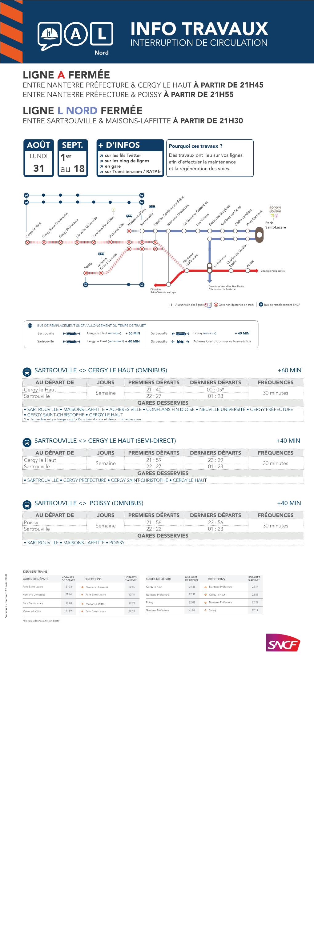 INFO TRAVAUX LIGNES FERMÉES ENTRE NANTERRE PRÉFECTURE & CERGY LE HAUT/POISSY PARIS SAINT-LAZARE & POISSY SARTROUVILLE & MAISONS-LAFFITTE FEV. + D’INFOS en gare 4 sur transilien.com sur le blog de ligne et 5 sur l’appli SNCF Rueil MalmaisonChatou Croissy Direction Versailles Rive Droite Nanterre UniversitéNanterre Ville Le Vesinet CentreLe Vesinet LeSaint-Germain Pecq en Laye et Saint-Nom la Bretèche Direction Mantes la Jolie desserte de toutes les gares 1 T 2 La Défense Poissy Grande Arche Achères Direction Paris centre Nanterre Préfecture Grand Cormier Paris Achères VilleConflans FinNeuville d’Oise UniversitéCergy PréfectureCergy Saint-ChristopheCergy le Haut Saint-Lazare Maisons- Laffitte Les Vallées Sartrouville Pont CardinetClichy Levallois Asnières surBécon Seine les Bruyères Nanterre Université DIRECTION DES LIGNES TRANSILIEN L, A, J - V1 – NE PAS JETER SUR LA VOIE PUBLIQUE La Garenne Colombes Houilles Carrières sur Seine Aucun Aucun train Aucun train Gare non desservie BUS DE REMPLACEMENT / ALLONGEMENT DU TEMPS DE TRAJET COVOITURAGE / SARTROUVILLE POISSY +60 MIN Pendant les travaux, SARTROUVILLE CERGY LE HAUT +60 MIN vous pouvez aussi RENFORCEMENT BUS covoiturer avec idvroom.com. Transilien vous offre votre trajet. N°36 PONTOISE CERGY LE HAUT Plus d’informations sur N°45 PONTOISE CERGY PRÉFECTURE/CERGY SAINT-CHRISTOPHE IDVROOM.com AUCUN RER/TRAIN ENTRE NANTERRE PRÉFECTURE & CERGY LE HAUT/POISSY PARIS SAINT-LAZARE & POISSY SARTROUVILLE & MAISONS-LAFFITTE POUR FACILITER VOS DÉPLACEMENTS, CHOISSISSEZ LE BON BUS VALABLE DANS LES DEUX SENS DE CIRCULATION . Vous souhaitez vous rendre dans les gares de Cergy Préfecture & Cergy Saint-Christophe : Empruntez un train de la ligne en direction de Pontoise puis, prenez le bus n°45 .